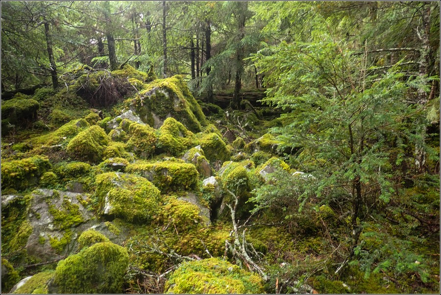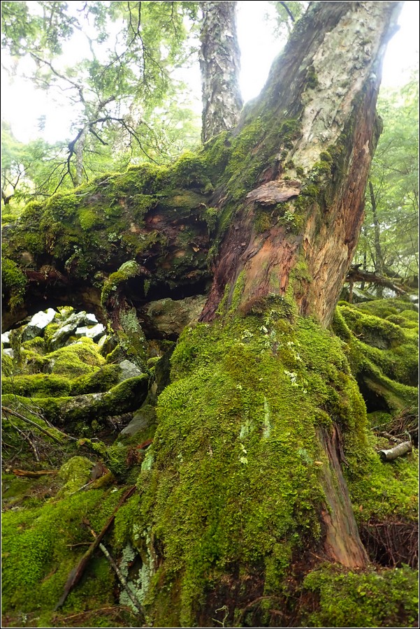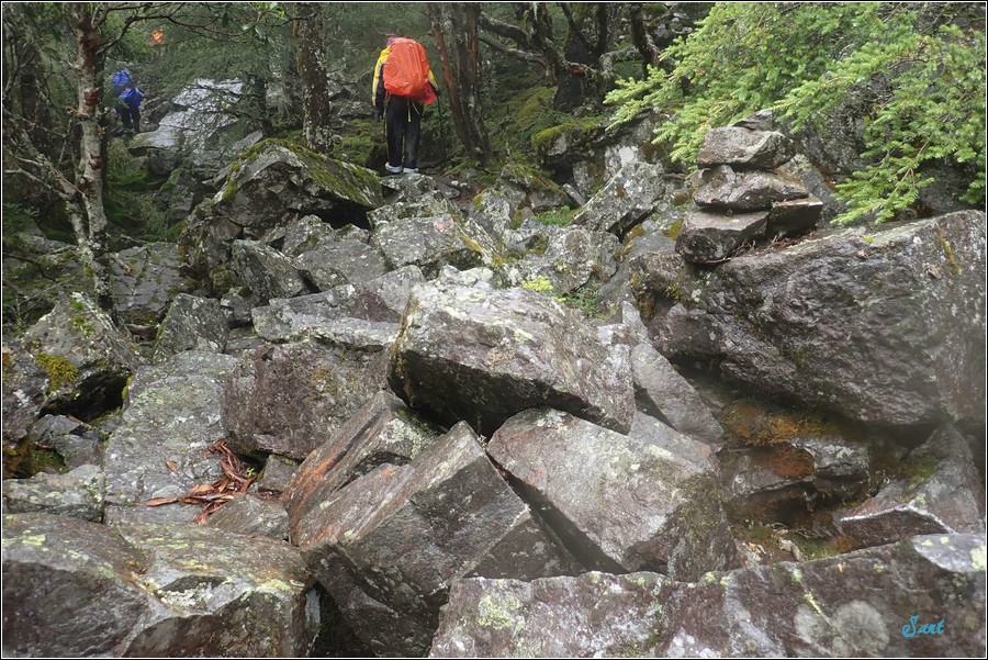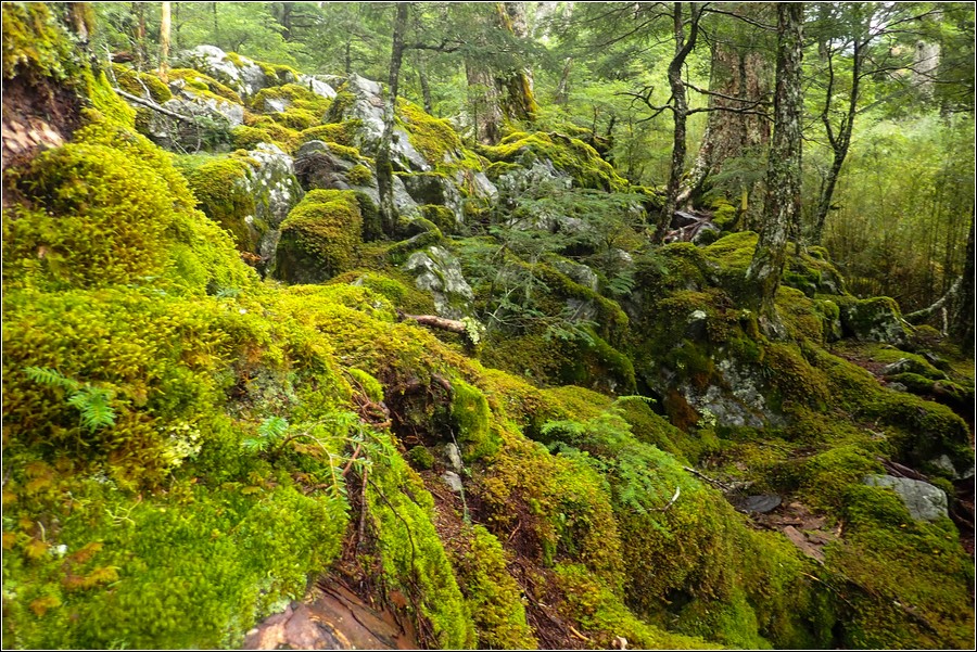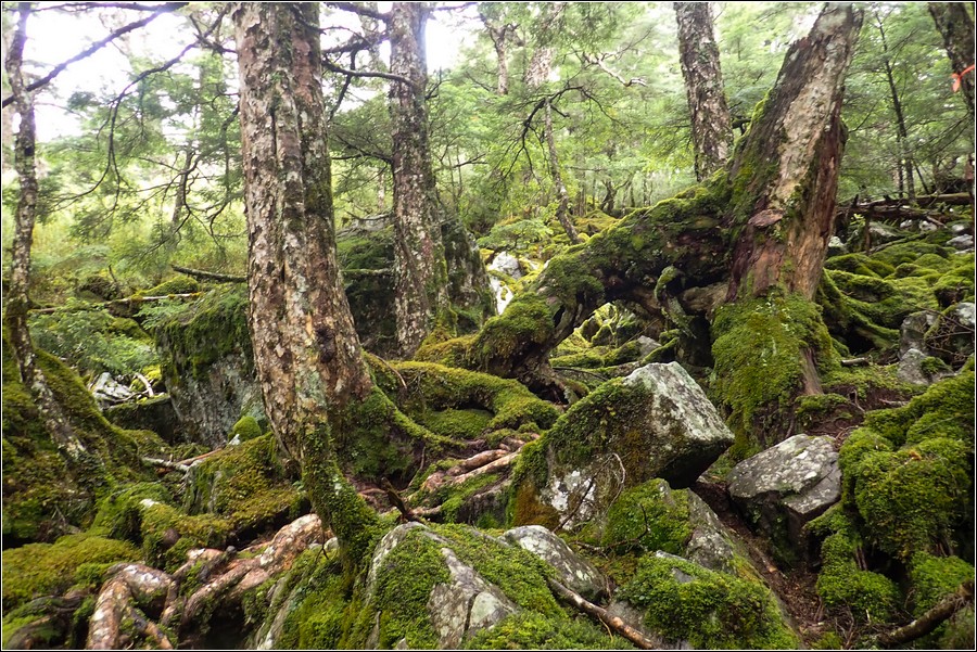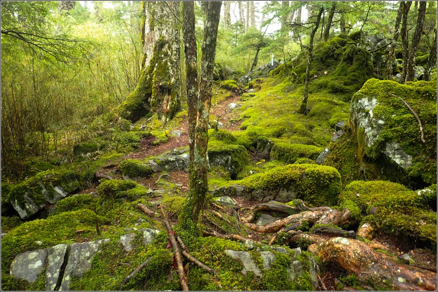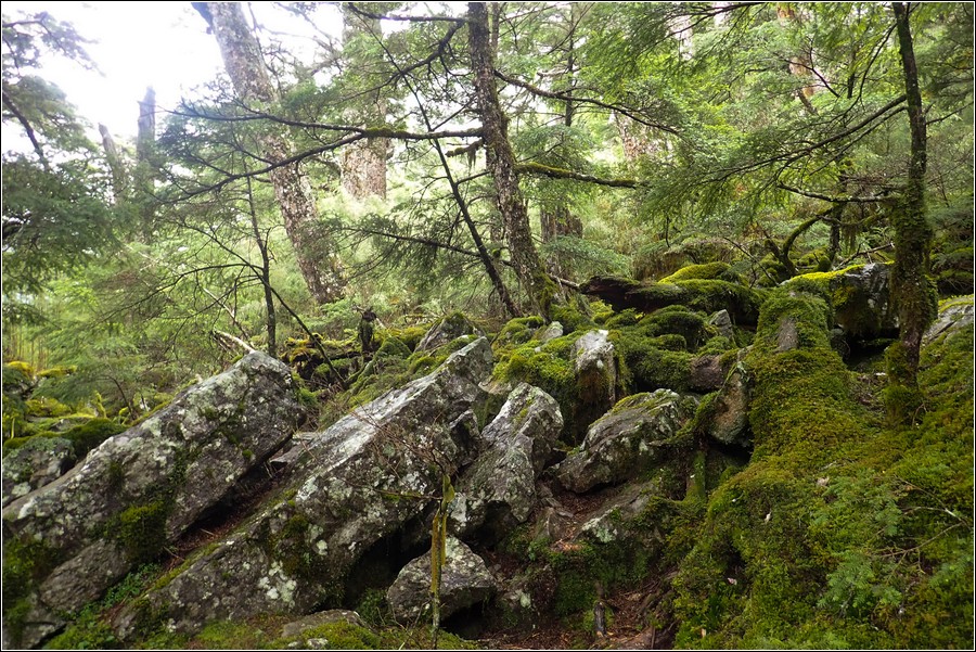 雖然這一段路徑是低矮箭竹坡,也不大好走,因為路徑全是高低、傾斜面不一致的石瀑地形,踩到傾斜石面鐵定滑倒。踢到躲藏隱蔽在箭竹裡頭的石板會往前摔,還好LOWA登山鞋的鞋尖夠硬。踩到高低不平的石板上,LOWA堅韌有彈力的高筒身都能安全保護住腳踝,安全性十足。