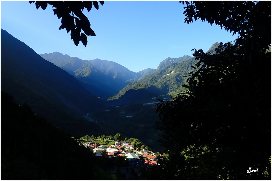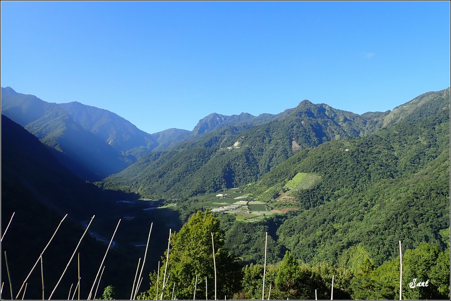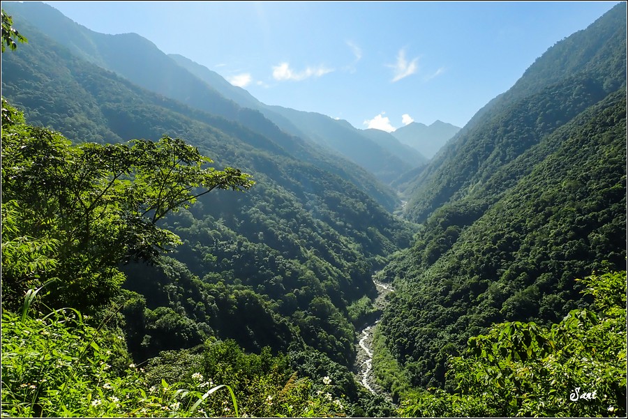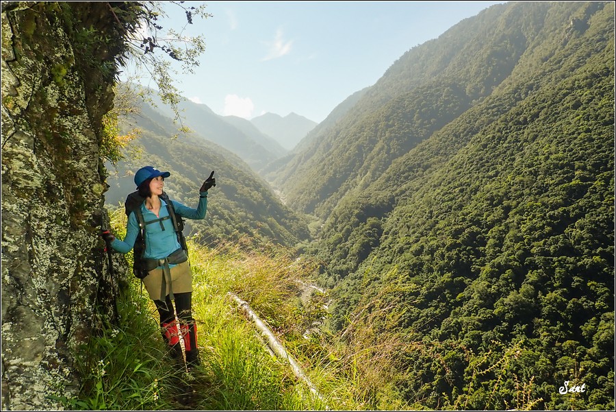 八通關古道沿著陳有蘭溪,向東南方向緩緩爬升,遠方如少女般尖挺的山峰,右側是八通關西峰,她的左邊稍微圓潤的山峰是這回小紅帽主要目標~八通關山。