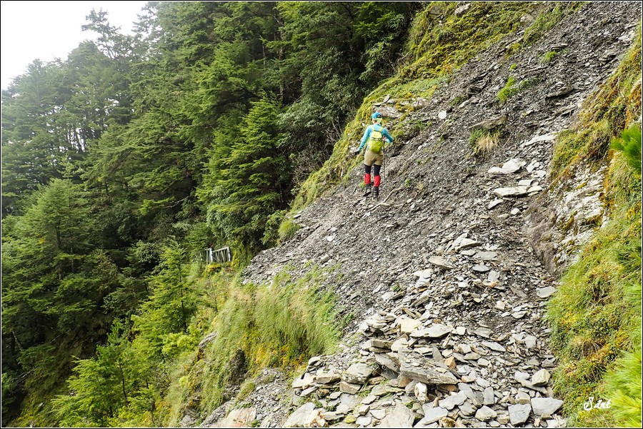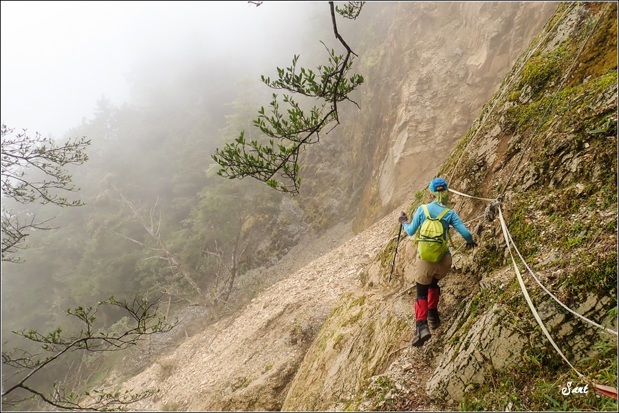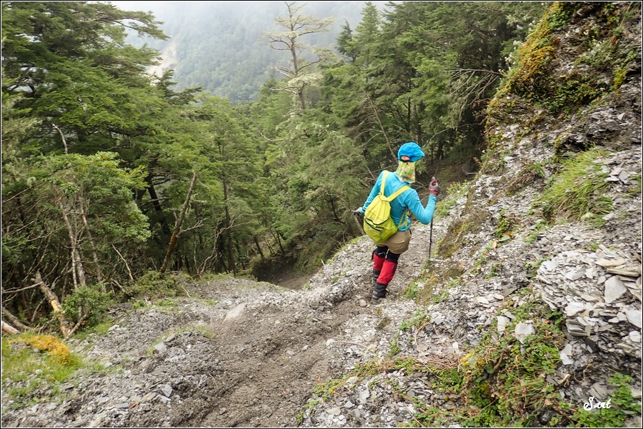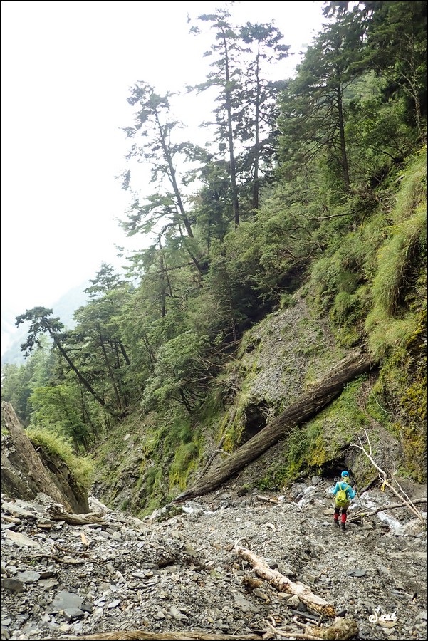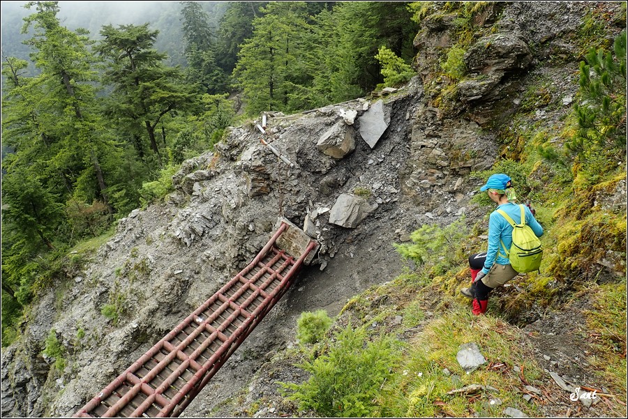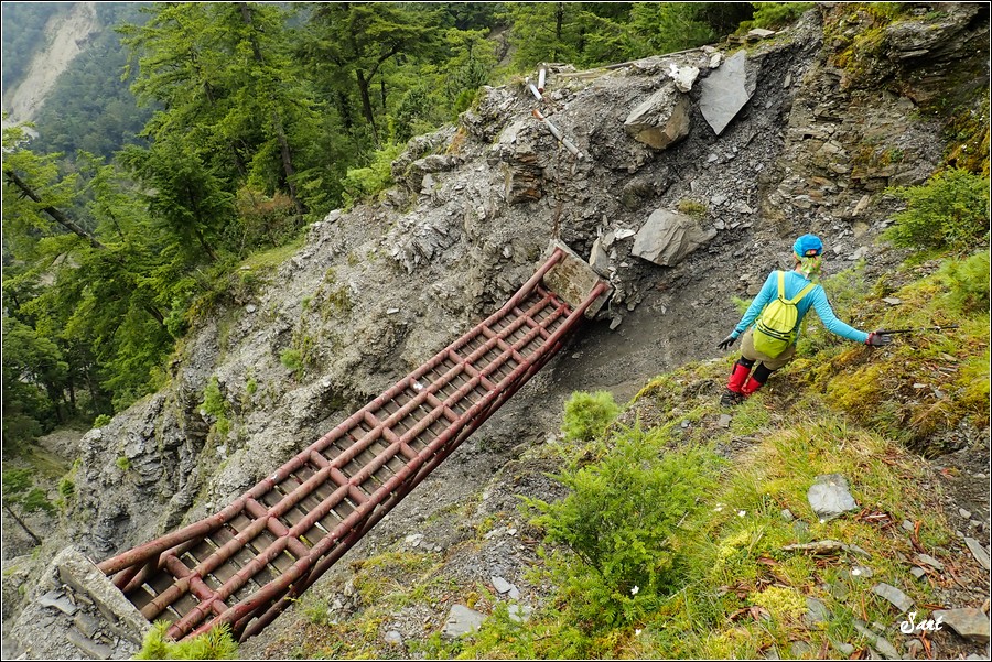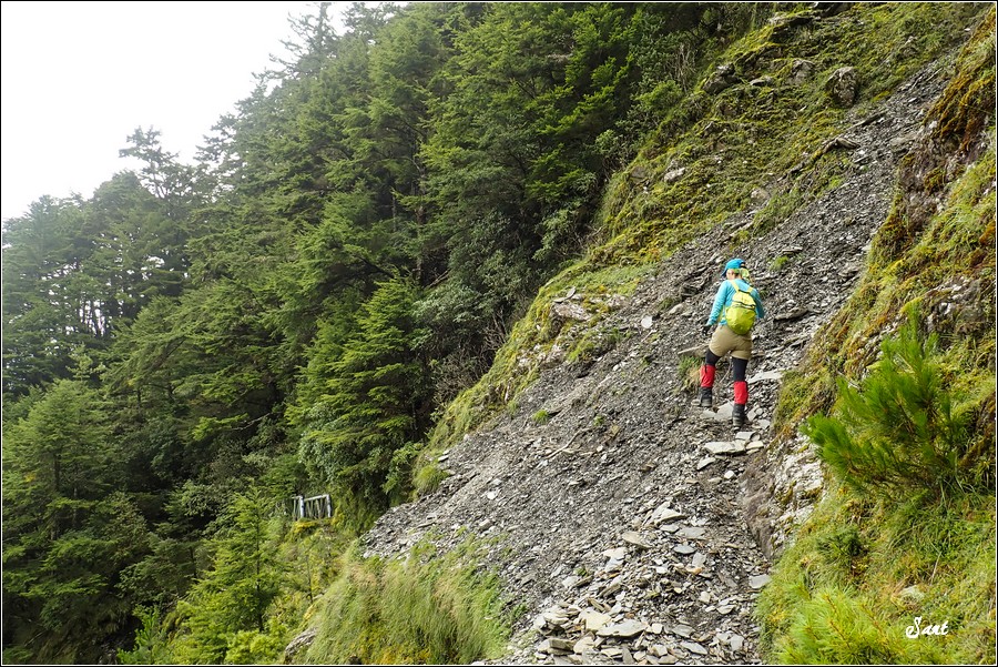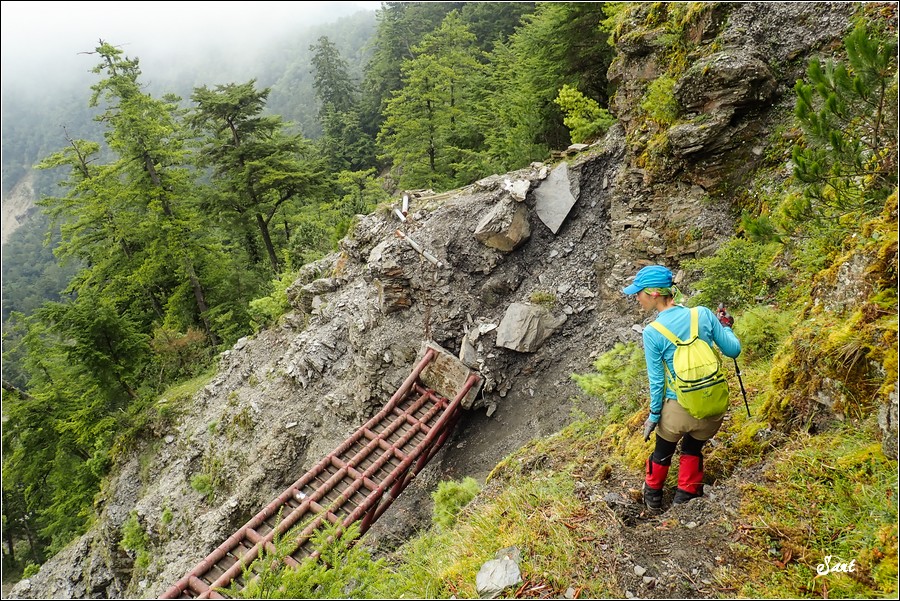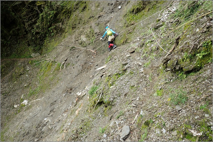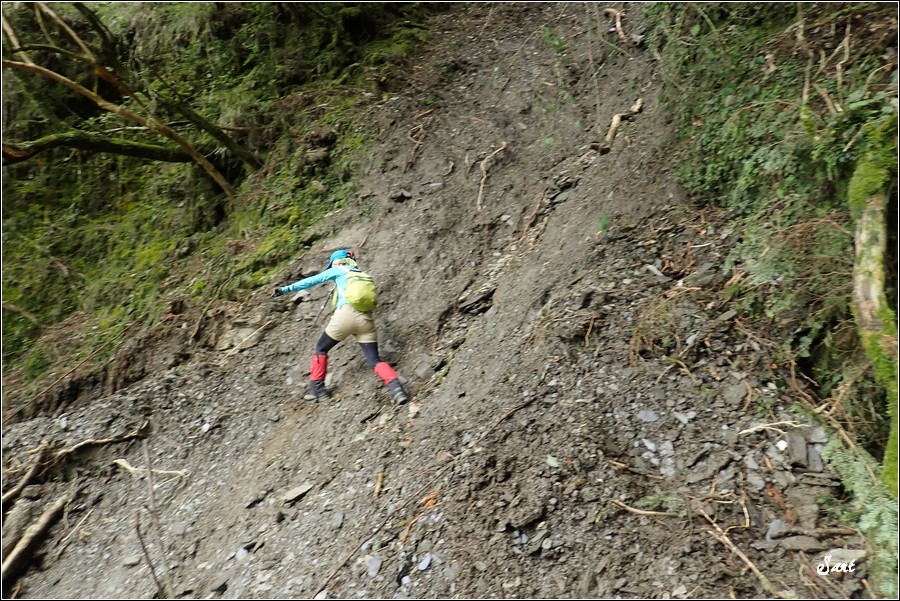 幸好我們二隻是輕裝,老狼不相信重裝可以繞過鐵橋,剛才上一張巧巧玲過鐵橋的照片很明顯可以看出陡峭砂石無法承受重裝者的重量,況且下大雨時粗砂會讓雨水持續沖刷讓踩點逐漸流失。