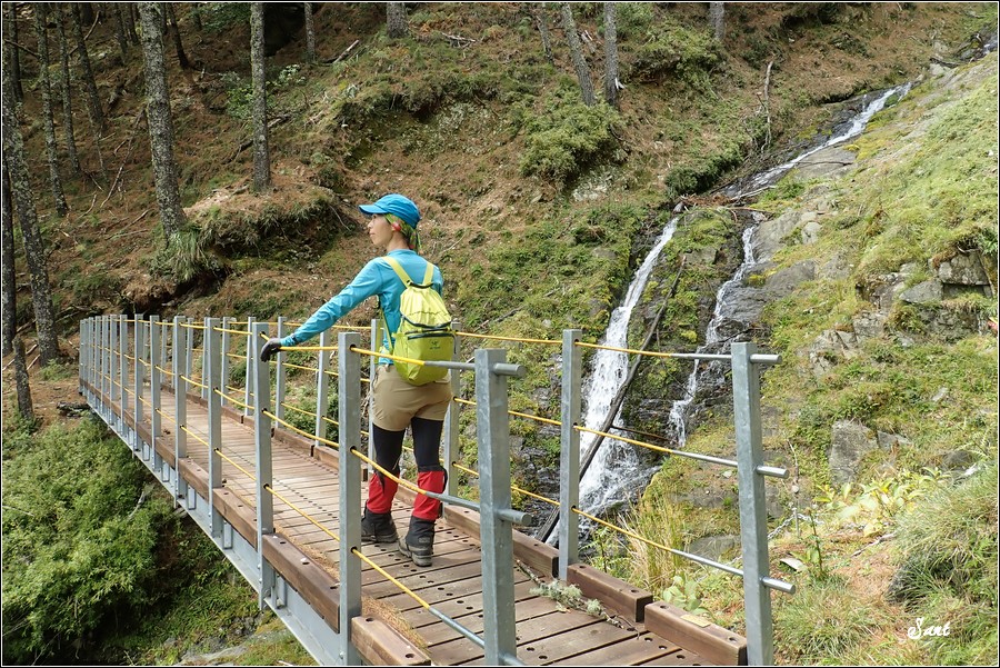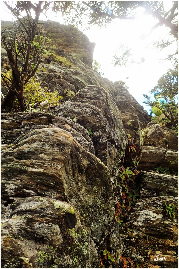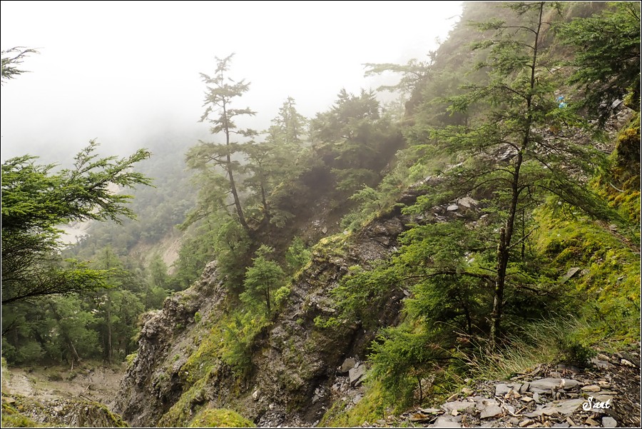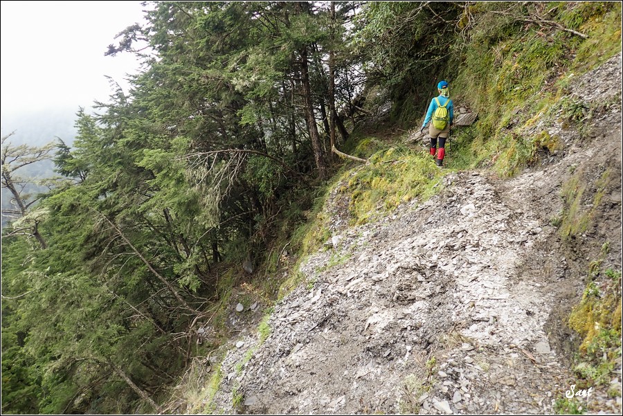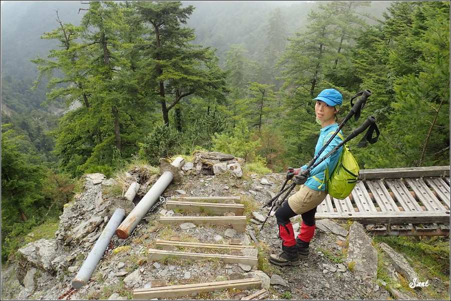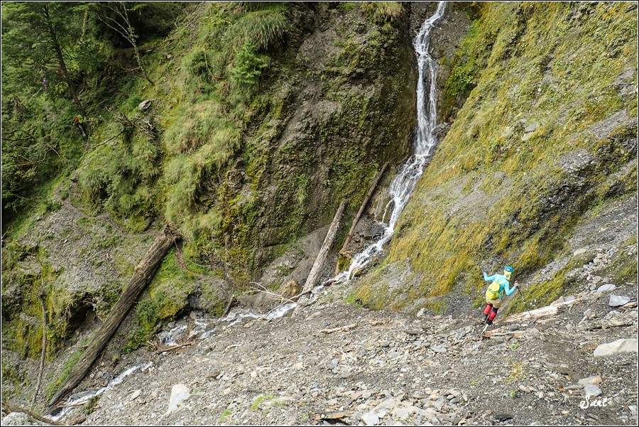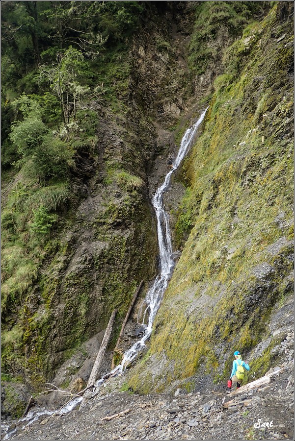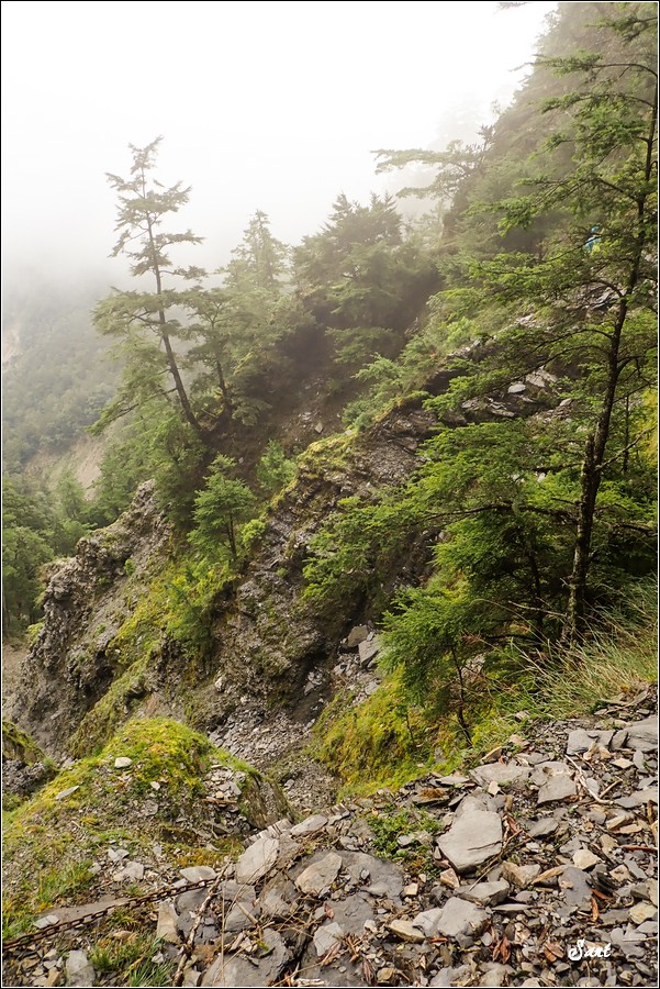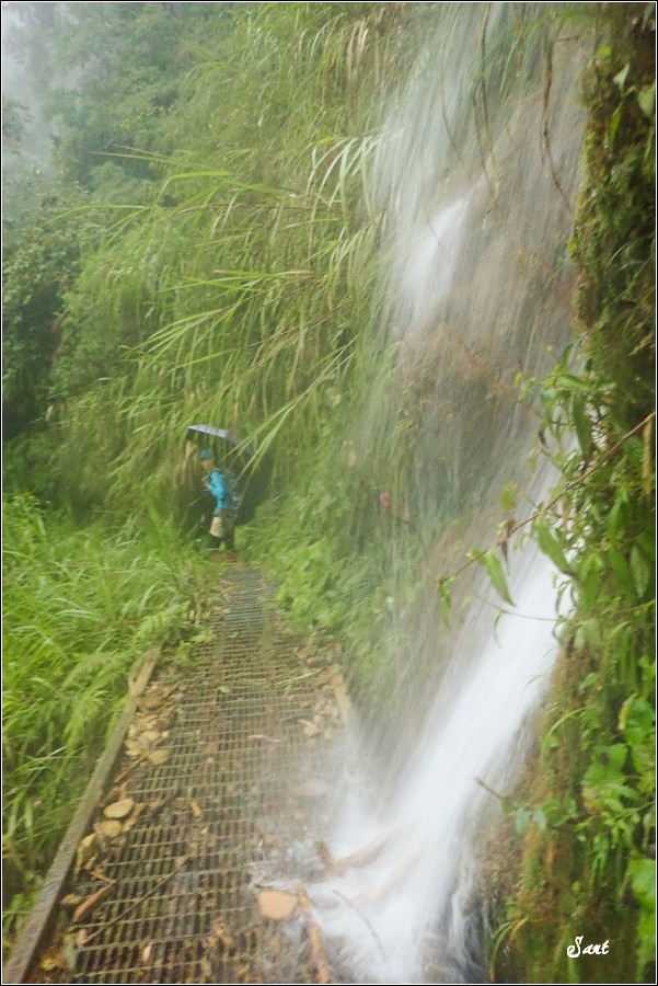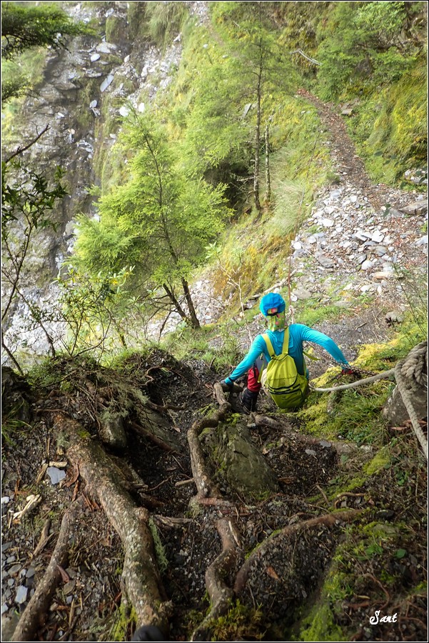 幸好我們二隻是輕裝,老狼不相信重裝可以繞過鐵橋,剛才上一張巧巧玲過鐵橋的照片很明顯可以看出陡峭砂石無法承受重裝者的重量,況且下大雨時粗砂會讓雨水持續沖刷讓踩點逐漸流失。