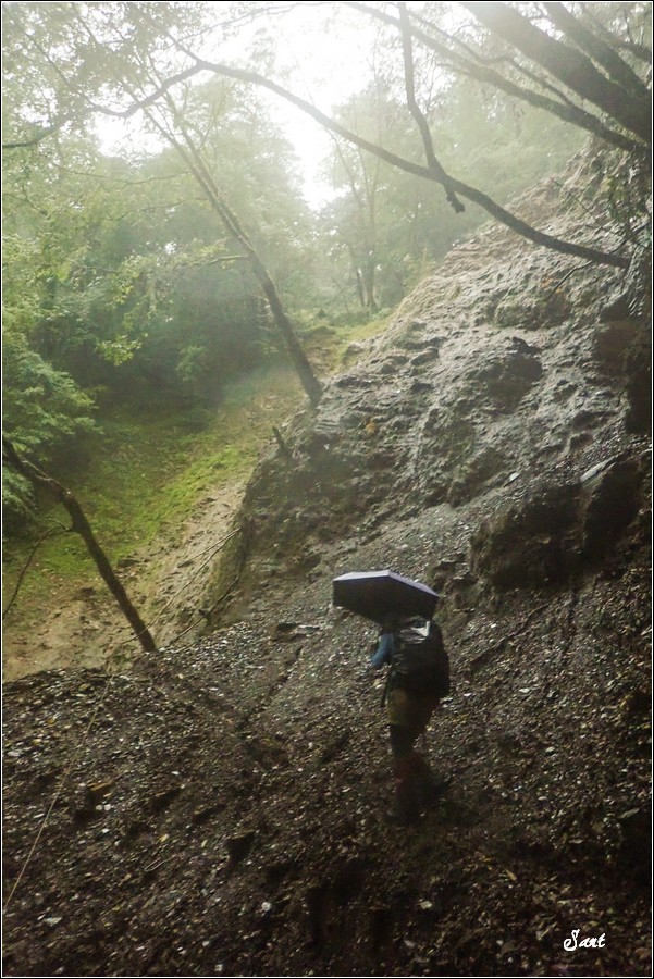 小紅帽很神勇,左手撐傘、右手拎登山杖,右手還得藉助山壁將身體重心移往山壁過崩塌!