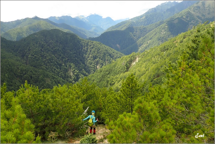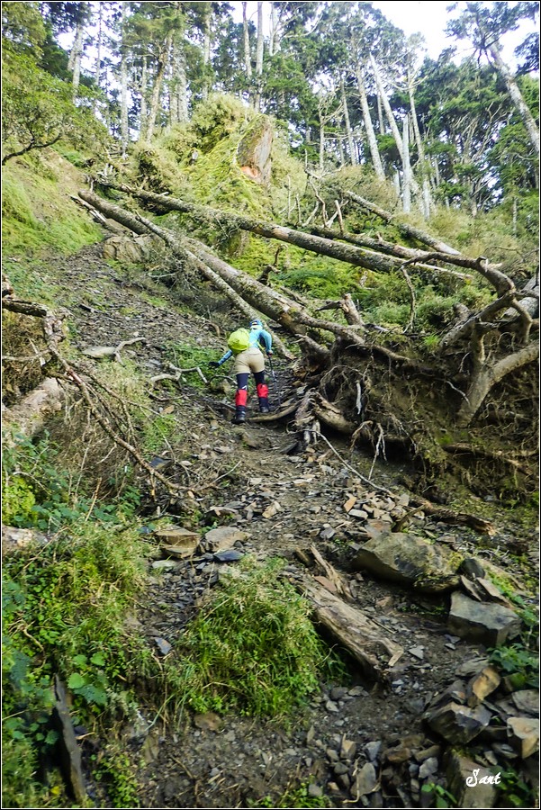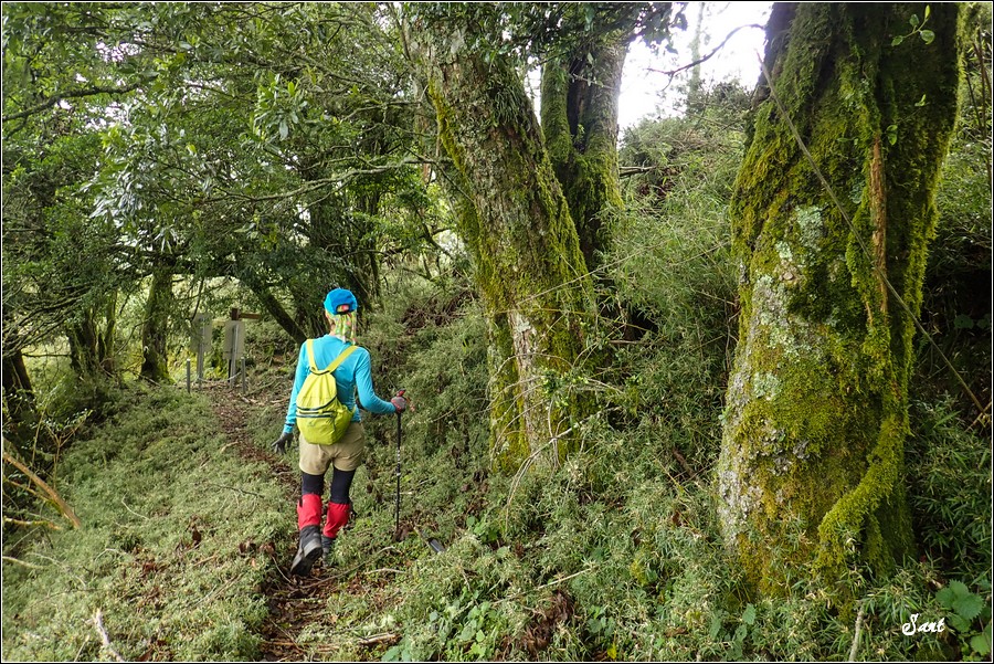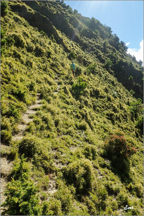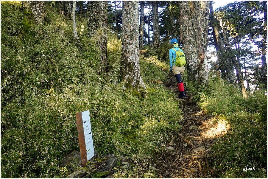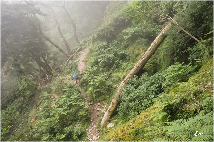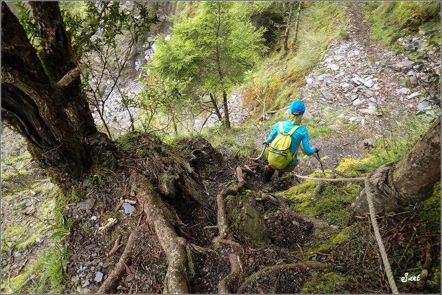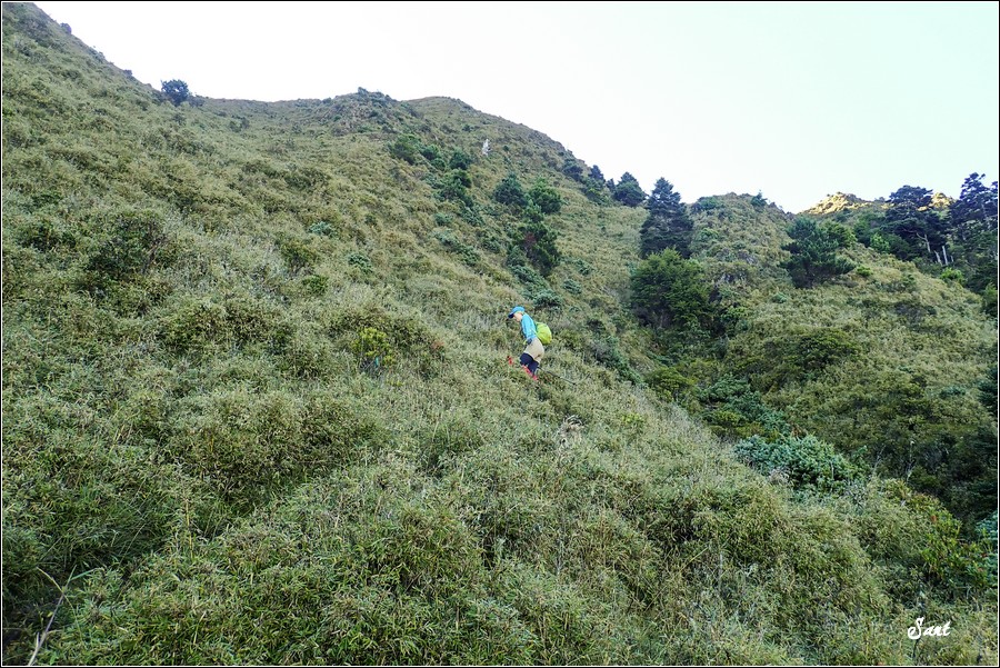 從叉路口往南陡下,路徑滿陡的,有點類似桃山,老狼很努力的靠雙杖幫助煞車。