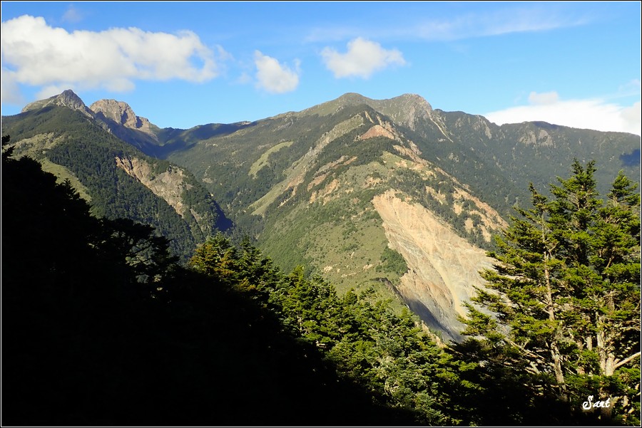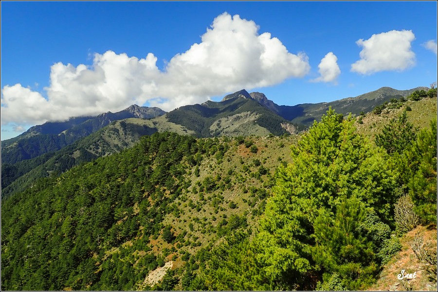 中央偏左鼻子尖尖的是達芬尖山,遠方最高、有點圓潤的山頭是雲峰。