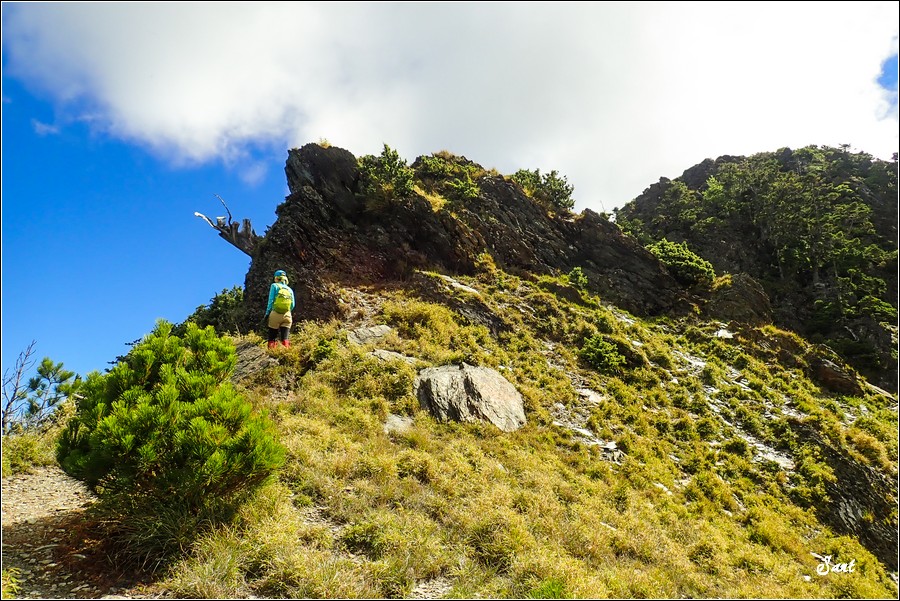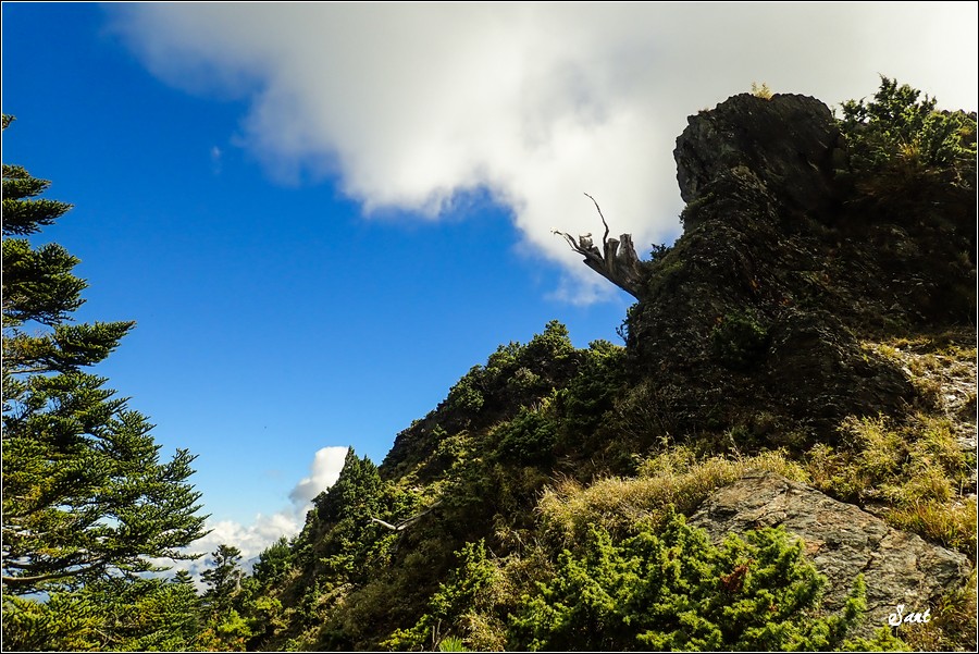 玉山東峰、玉山主峰上頭的白雲是雷雨胞,發展的頗為迅速,老狼盡顧著賞景、賞花,忘了它待會就會讓我們吃苦頭。