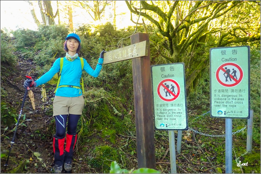 小紅帽左手旁的二個警示牌,是玉管處禁止通行的路徑,就是剛才處處險境的腰繞路線。