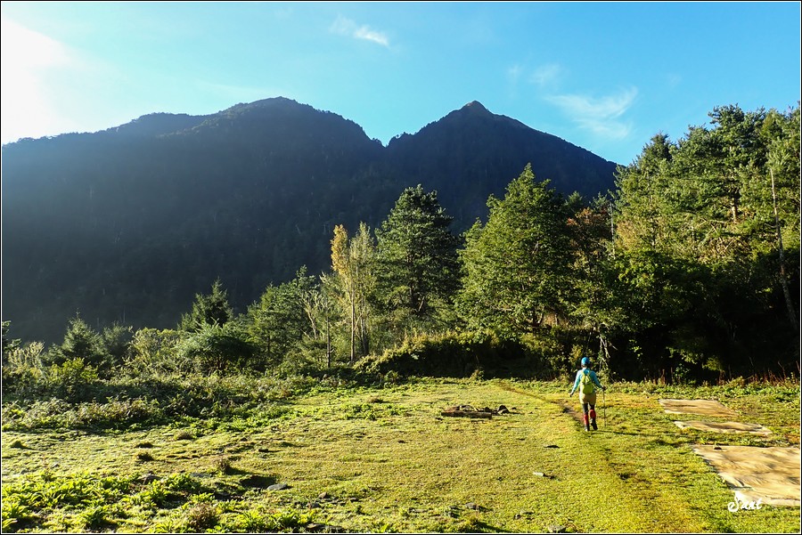 我們回到觀高坪時遇到原本在我們之前的二個小隊,一隊是在八通關登山口遇到有一個老外的三人組,他們走馬博橫斷;另外一隊是剛才在崩塌溪谷聽到喊123的年輕三人組,他們走大水窟。