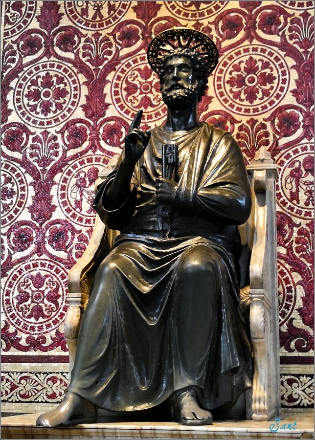 聖彼得閉目端坐,左手緊握兩把天國大門鑰匙,右手指向天,默禱謹守耶穌傳承。銅像背景看似織錦,實為馬賽克。