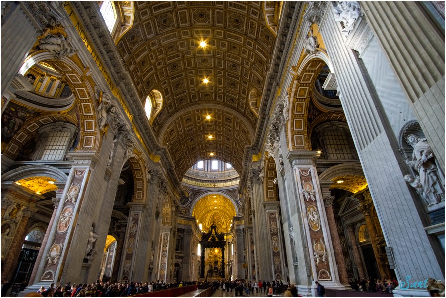 前面有五座大門可以進入教堂,從右到左分別為聖門、聖事門、中門、善惡門、死門。聖門只在聖年才能開啟。所謂「聖年」,最早由教宗卜尼法斯八世在1300年頒布《自古即有》詔書宣布聖年新紀元開始,並規定每百年慶祝一次。一百年顯然是太長了,大部分人一生無法得見,經瑞典聖徒布里奇特建議,教宗克萊蒙特六世將其縮短為五十年。五十年說實話也不短,烏爾班六世以耶穌在塵世中生活了33年為由又將其縮短為33年。1470年保羅二世頒布《無法形容的天主照顧》詔書,再次將其縮短為25年,並約定1475年為聖年,以求在其有生之年能經歷一次。不幸的是他沒有活到1475年,繼任的西斯廷四世占了這個便宜,並將此慣例一直保持。不過進入20世紀後,聖年變得更加頻繁,也許是教宗認為這能更好地宣揚推廣天主教,也許是教宗迫不及待地想親自主持一次聖典。(引用:教你如何看懂聖彼得大教堂)