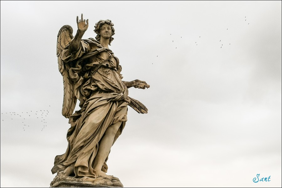 天使左手拿著二支將耶穌釘在十字架上的釘子。