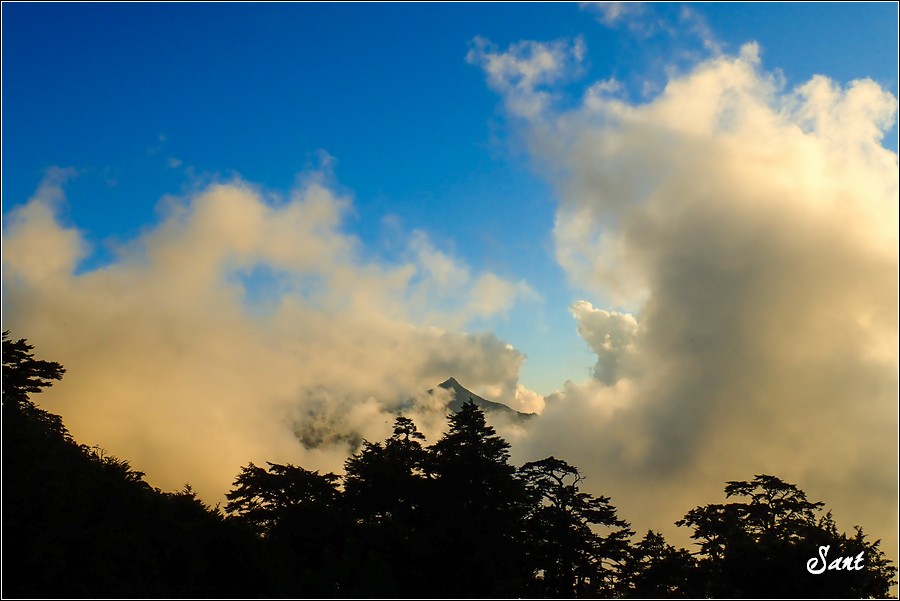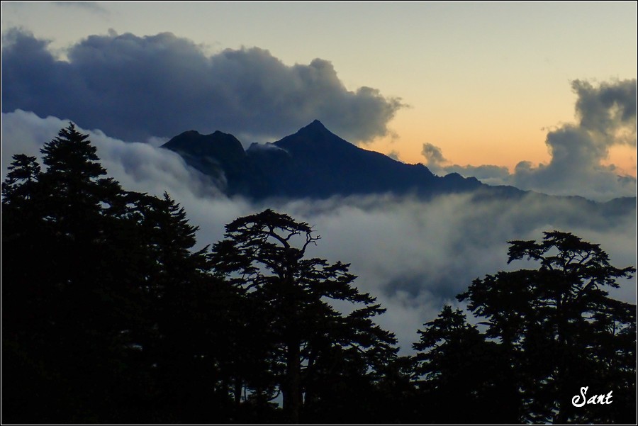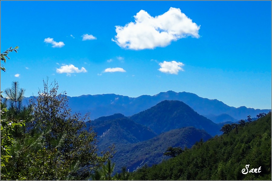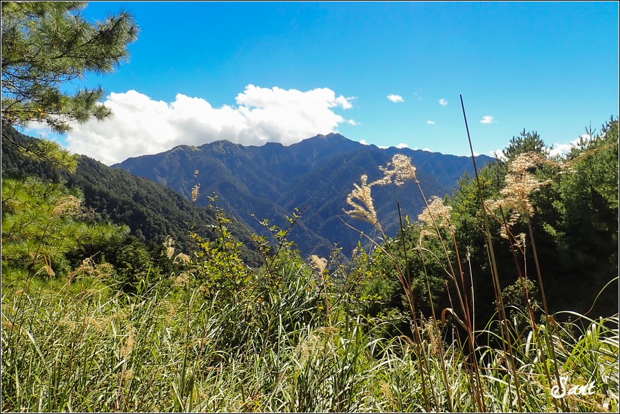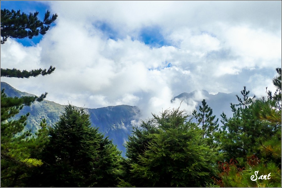 中午山區起雲了,往南方偏東向展望過去,最高、最尖的是能高主峰,能高主峰的左邊是「牛魔王」~卡賀爾山,要繼續深入到天池山莊附近才能觀賞到為何卡賀爾山被稱為「牛魔王」。