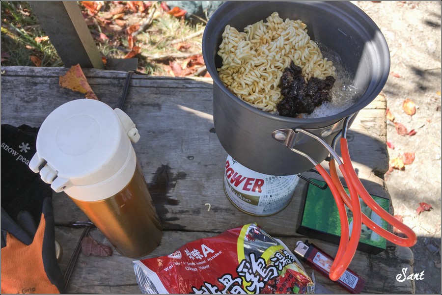 這回除了背二台傻瓜相機,通常,老狼都是行動糧超量攜帶,因為老狼牙都幾乎掉光,吃飯速度慢,擔憂早、晚餐跟不上隊員,只好多帶一些行動糧以備萬一,可以邊走邊吃。其實,每次結束上山任務後,行動糧都會剩很多,往往行動糧是老狼的累贅,卻也是老狼的安全支柱,似乎已是改不掉的老毛病。