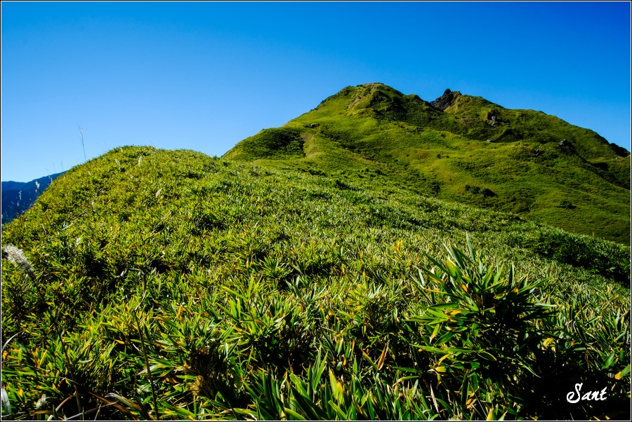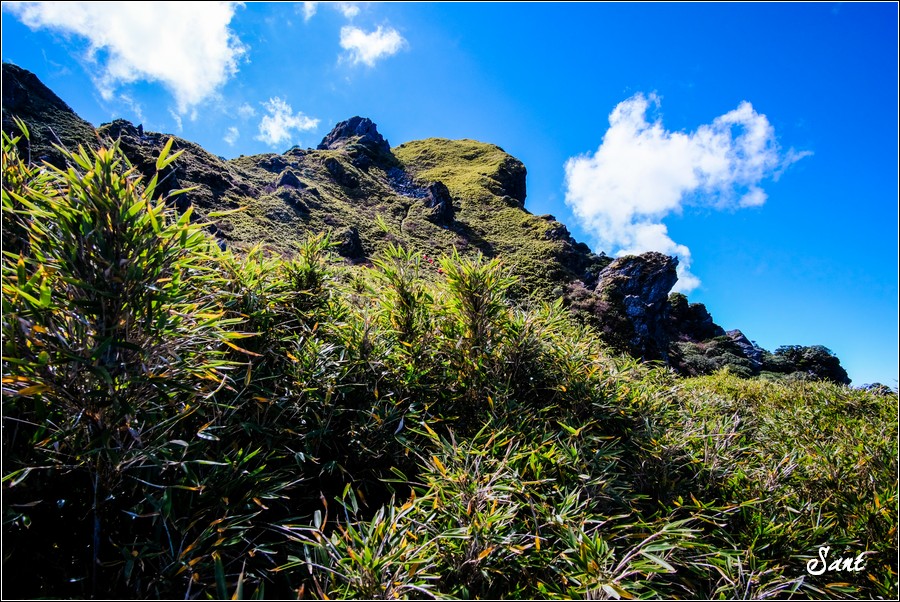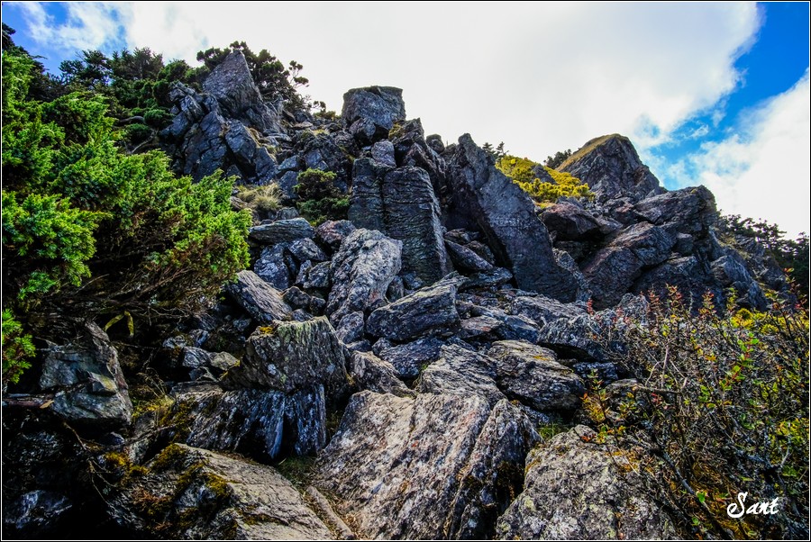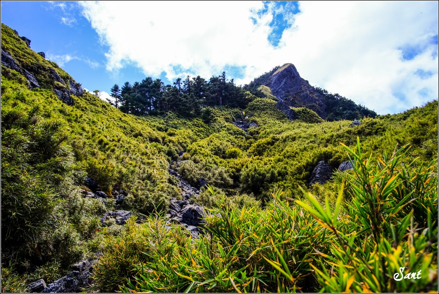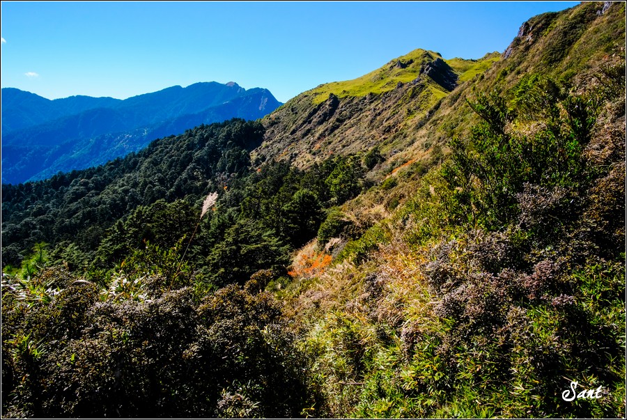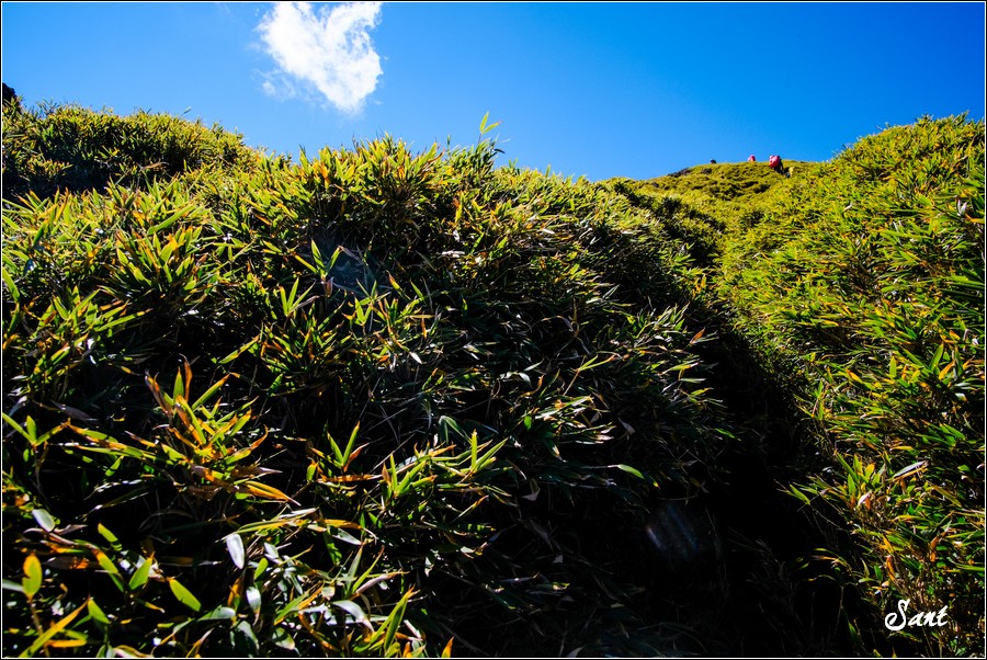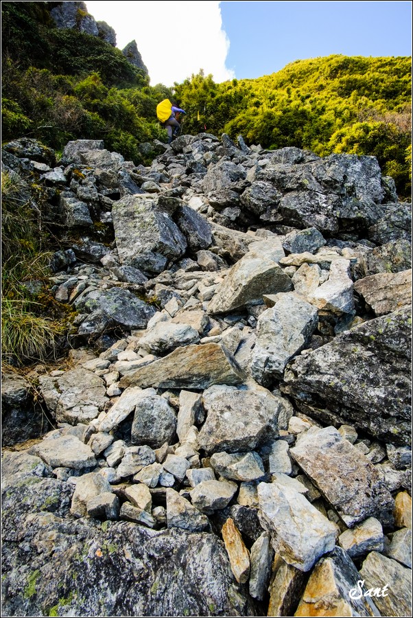 這一段很陡的碎石坡因為地質已經穩定,箭竹方能大舉進駐成林。雖然坡很陡,感謝有箭竹相伴,狼爪左右開弓,利用箭竹借力使力,尚能維持爆氣的邊緣持續上攀。