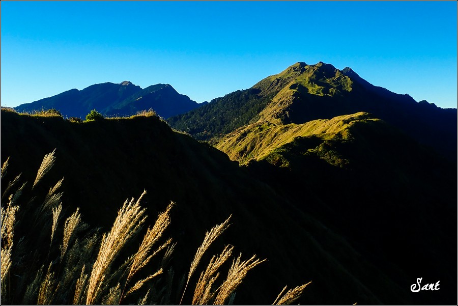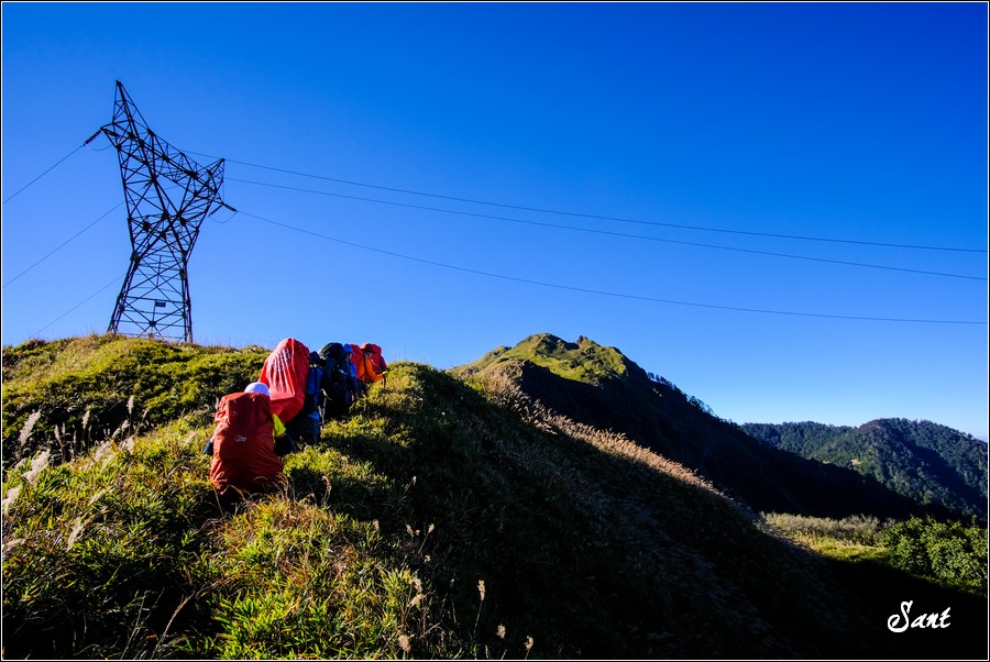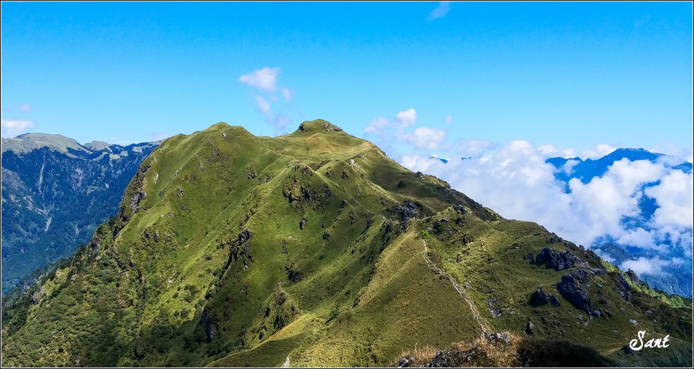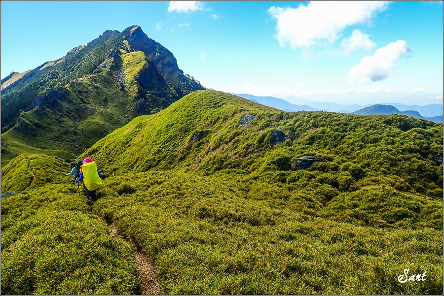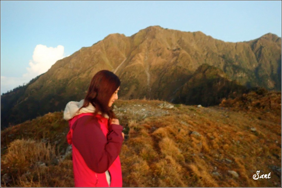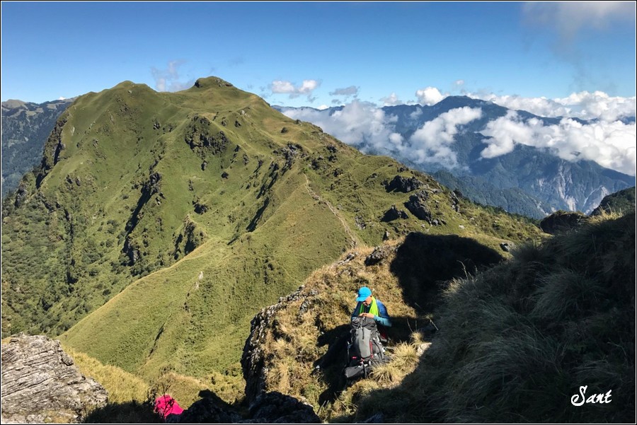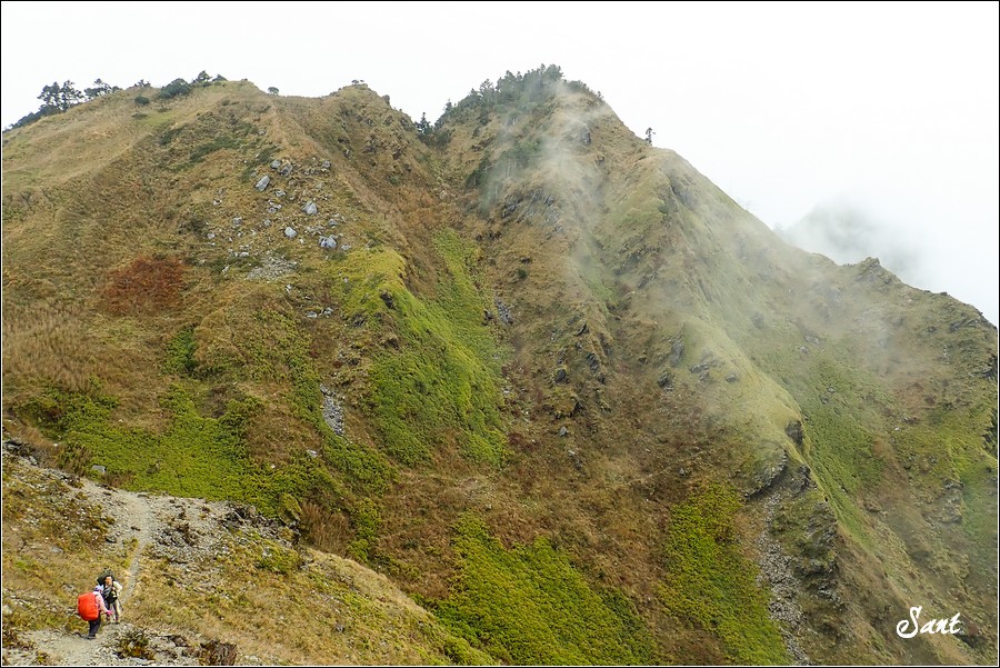 ~能高山矗立在左前方,今晚落腳處在它的左側最低鞍,看起來不遠,卻讓老狼喘到不要不要的!