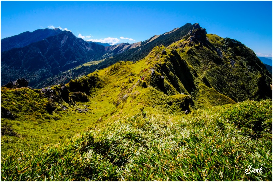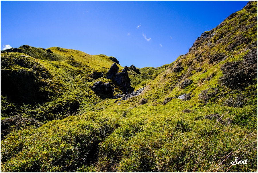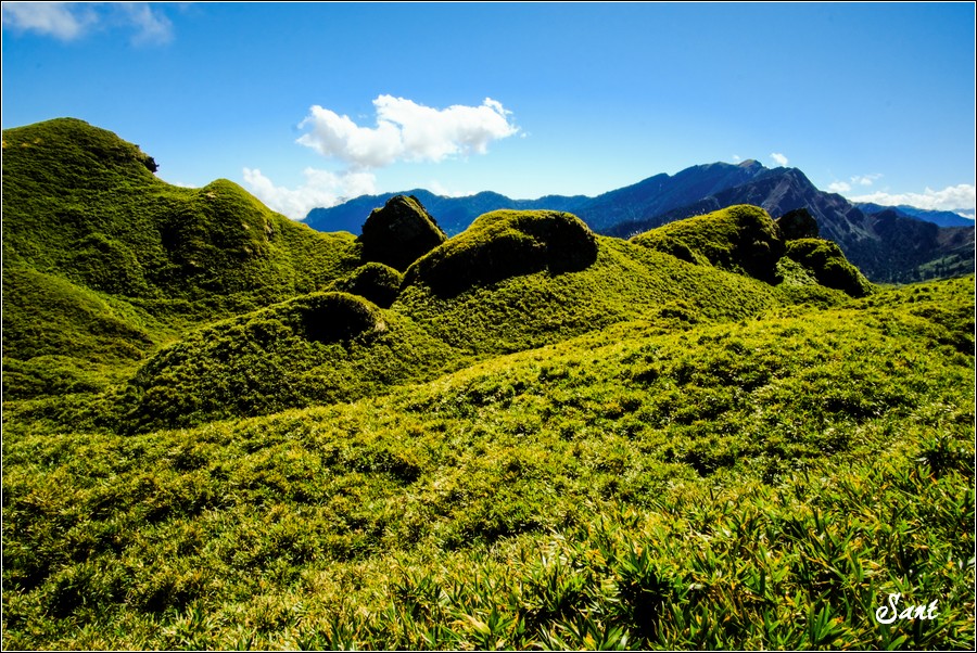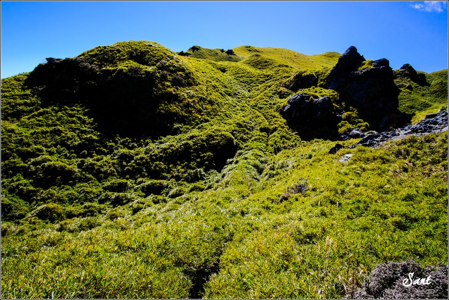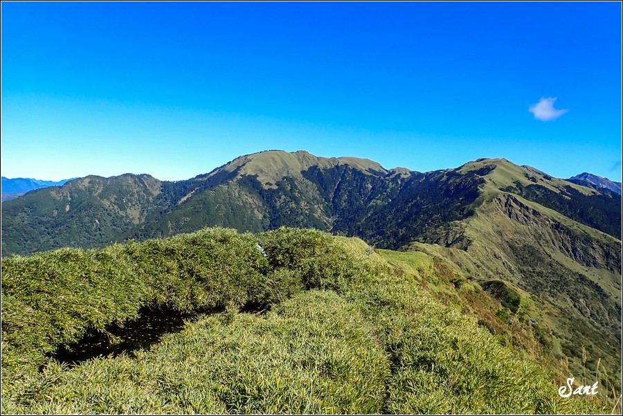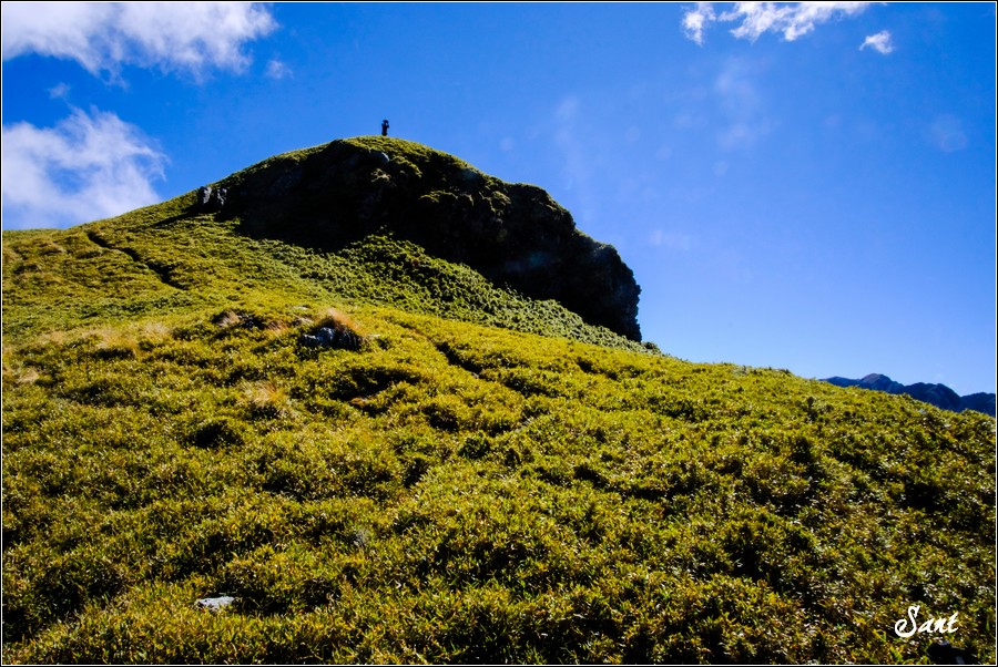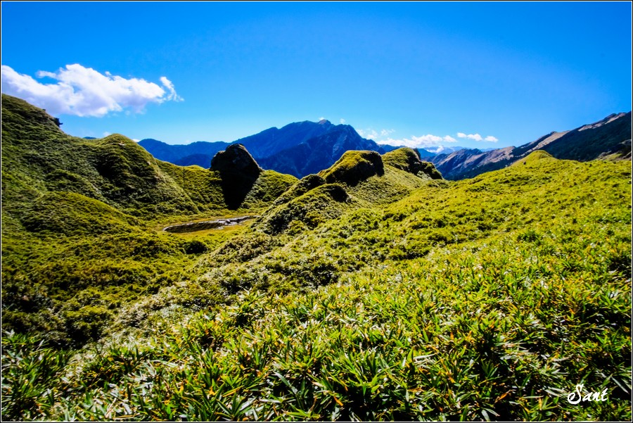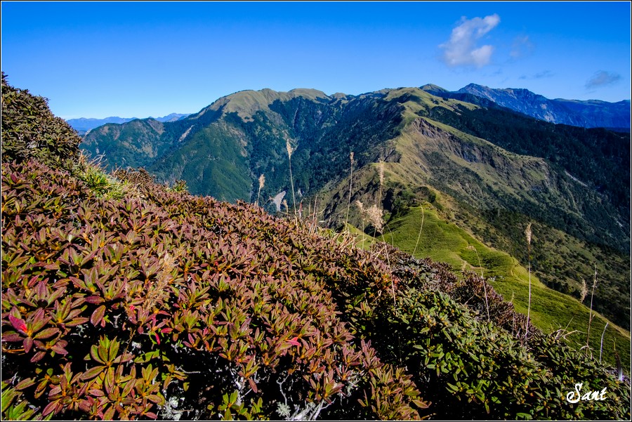 進軍「牛魔王」卡賀爾山前的大草原不時會見到一搓一搓,顯得有點難看、暗沈的雜色植物,就近方知是高山杜鵑。這張也是回首來時路,將深堀山、奇萊南峰、南華山與藍天當背景。