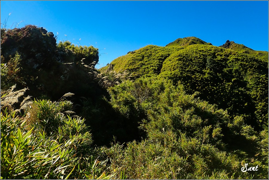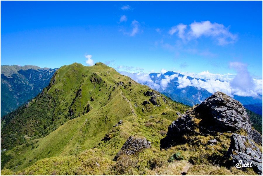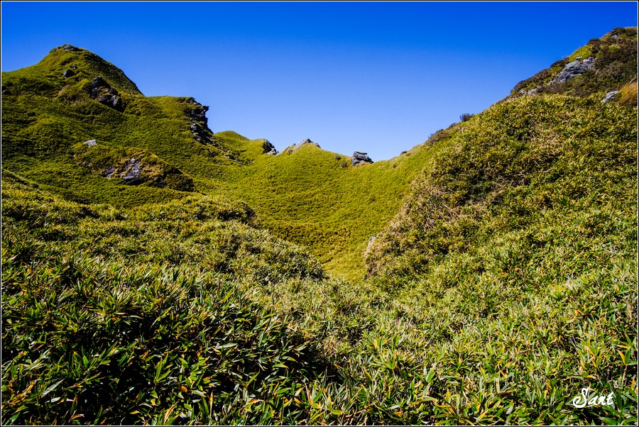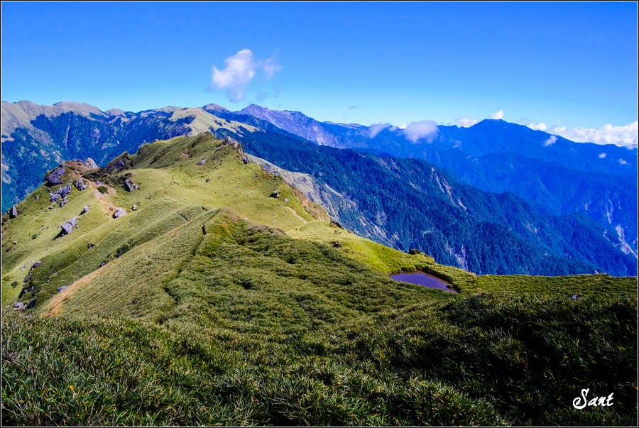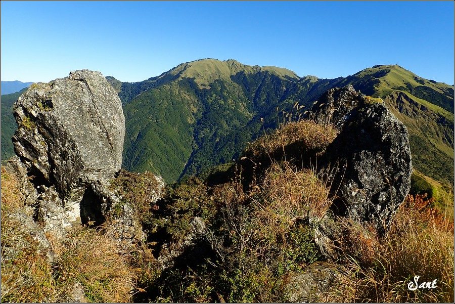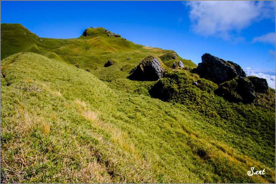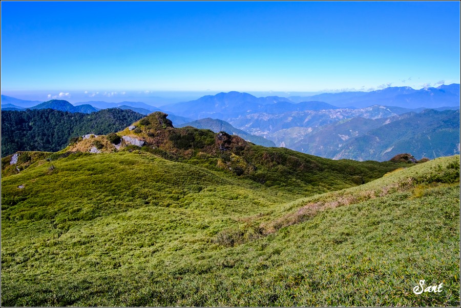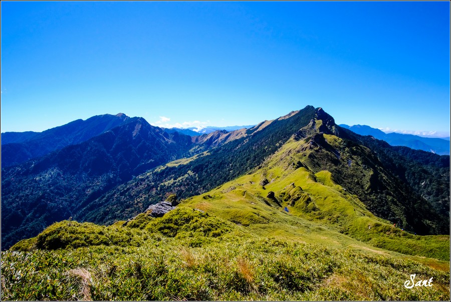 進軍「牛魔王」卡賀爾山前的大草原不時會見到一搓一搓,顯得有點難看、暗沈的雜色植物,就近方知是高山杜鵑。這張也是回首來時路,將深堀山、奇萊南峰、南華山與藍天當背景。