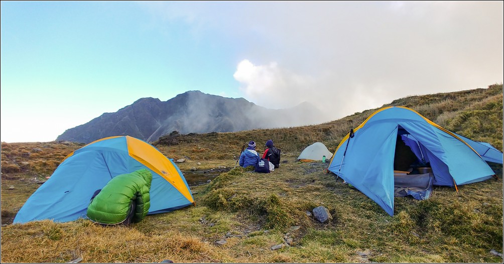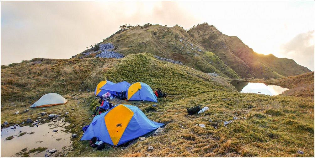 大陸池營地腹地不大,水池上層平坦的位置只堪容納二頂四人帳,老狼室友只能選擇水池邊。