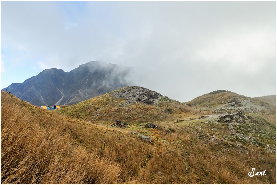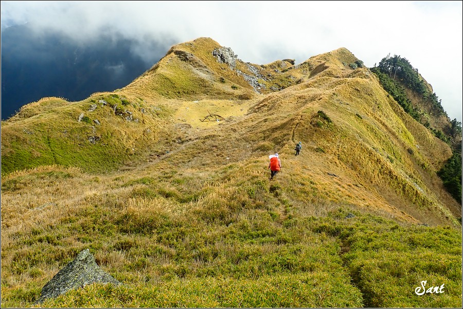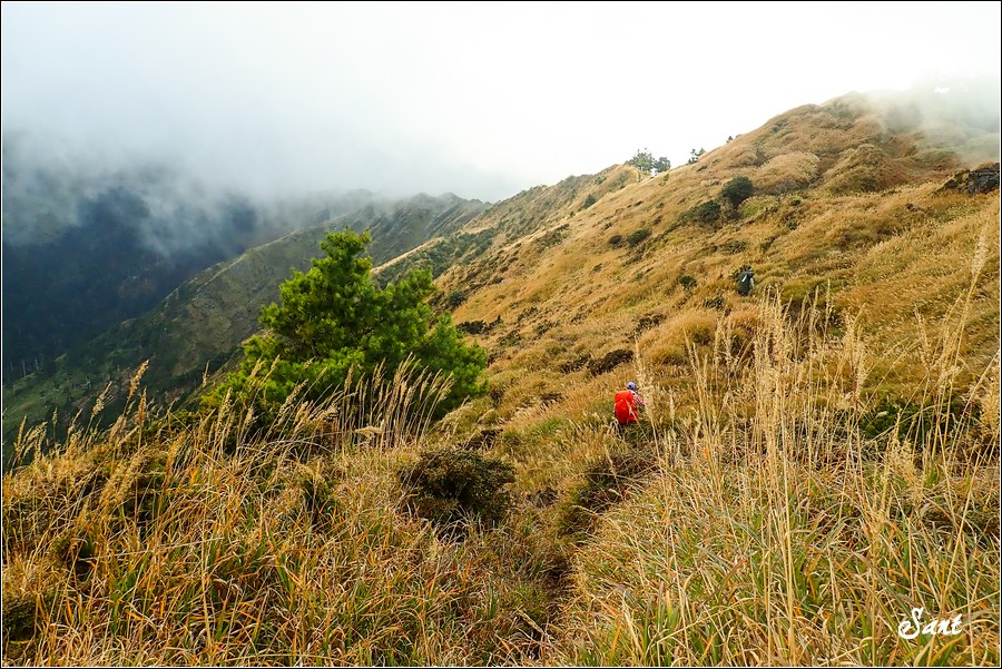 過了能高山屋遺址之後的景致,仍是大片死亡箭竹所形成的金黃色草原,倘若有陽光的話也是相當震撼的風景面。