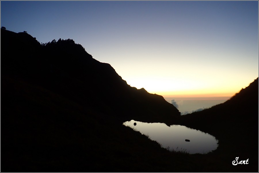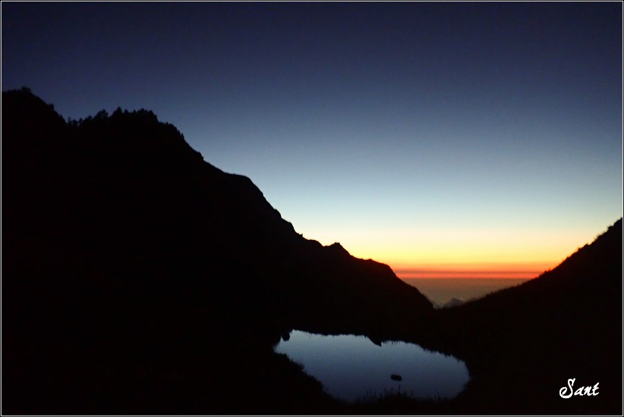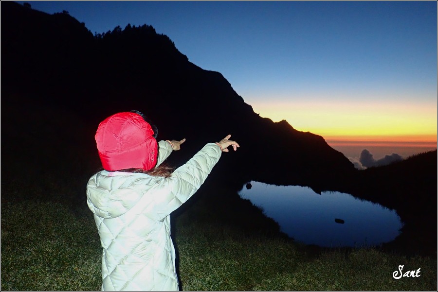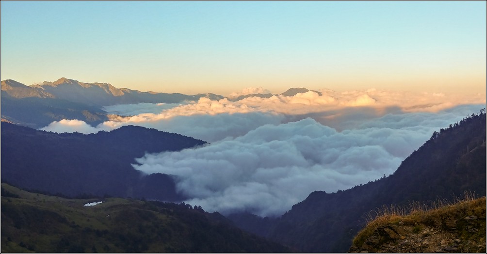 今天的彩霞將東南面的能高南峰燒紅了,比新疆的火燄山更美,老狼帶小狼去過,因為新疆的火燄山沒有眼前這片大陸池襯托出美景啊!