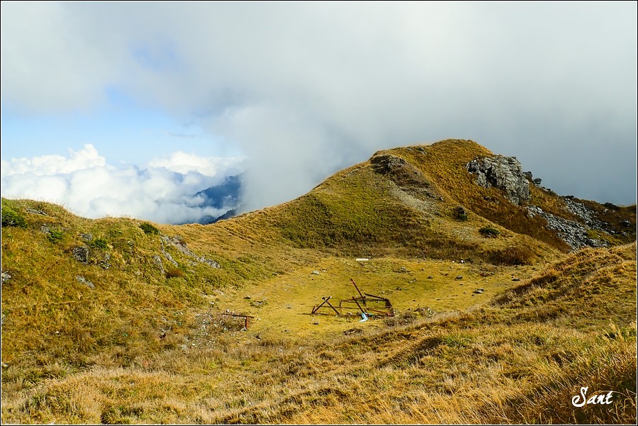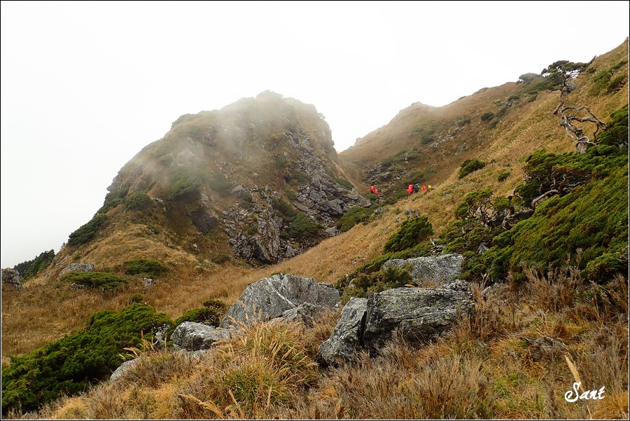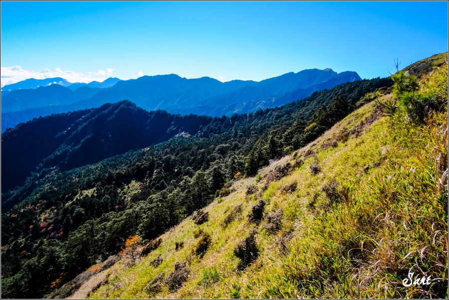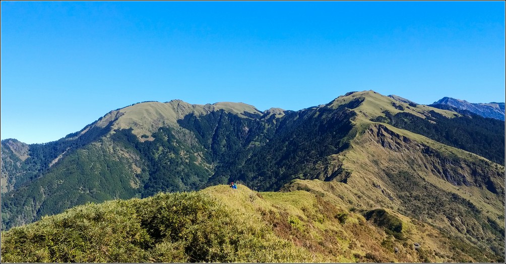 從能高山往南切之後整個景色跟上午差異灰熊大,不是起雲、因天的關係,也不是老狼的相機發色異常,是大片草皮、箭竹大量死亡的異常現象。