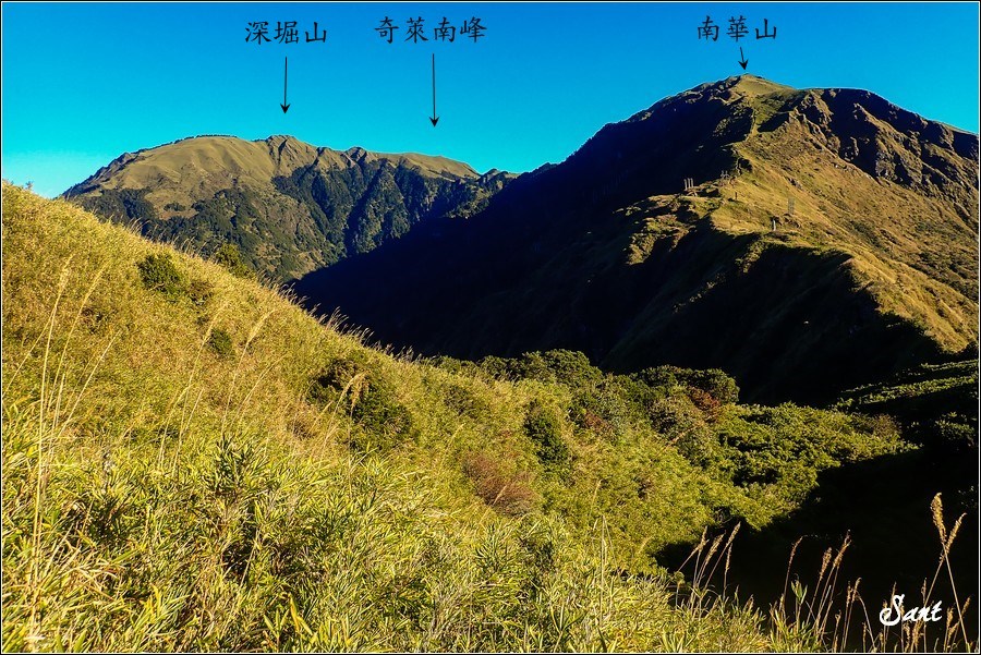 回望來時路,深堀山、奇萊南峰、南華山。左前方是「深堀山」,天池山莊在它的右下角密林中。