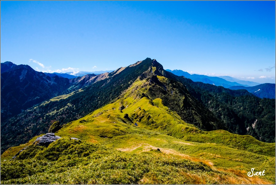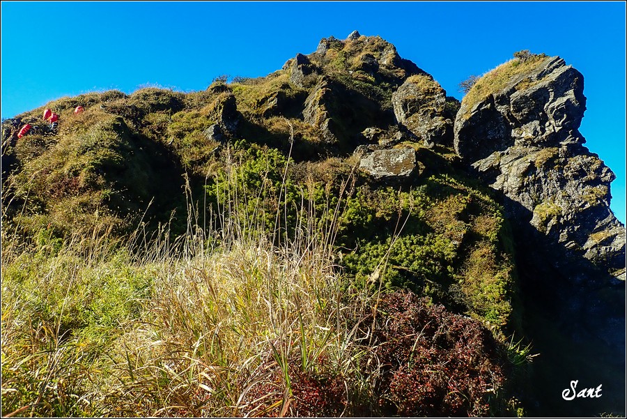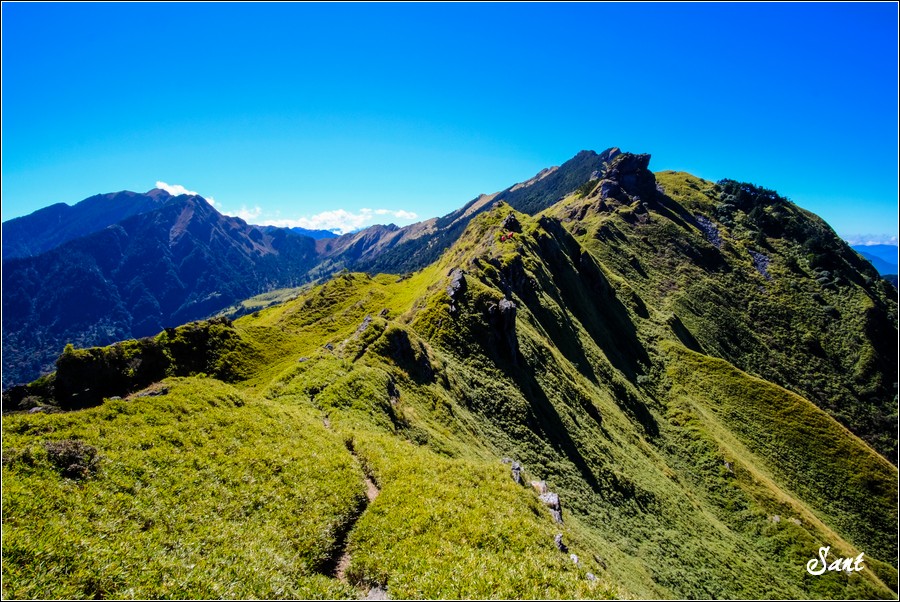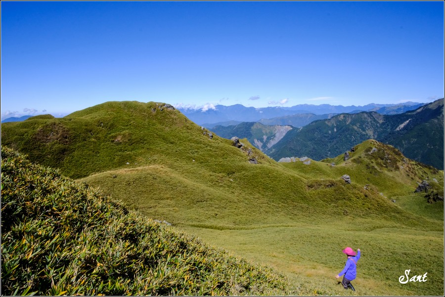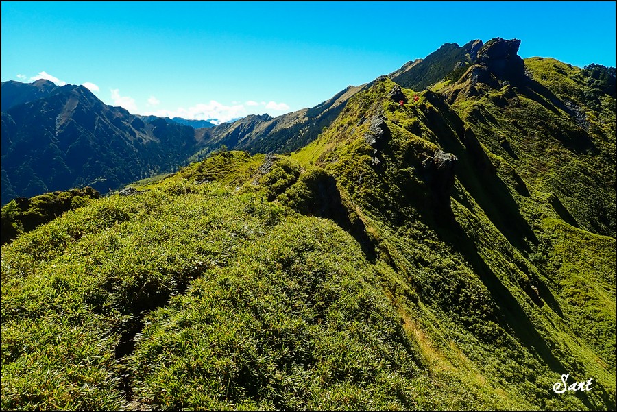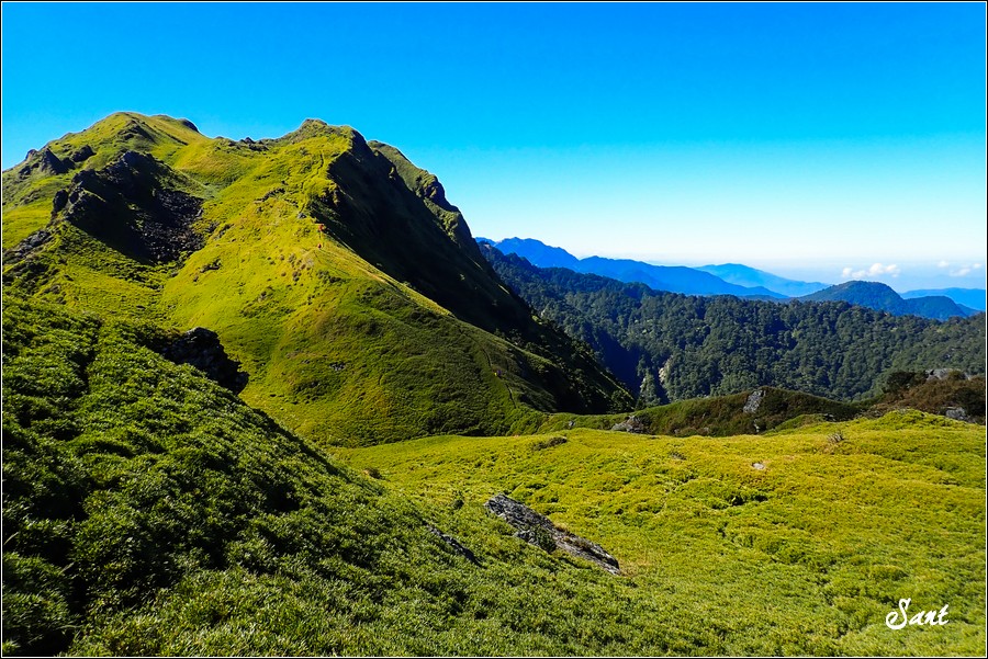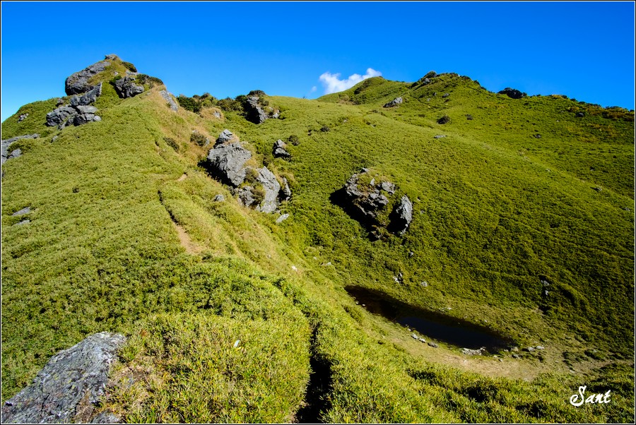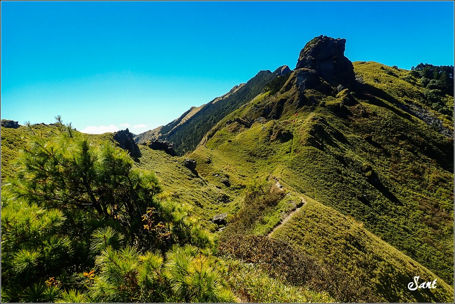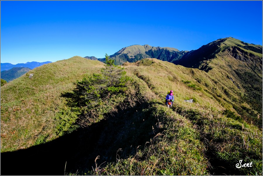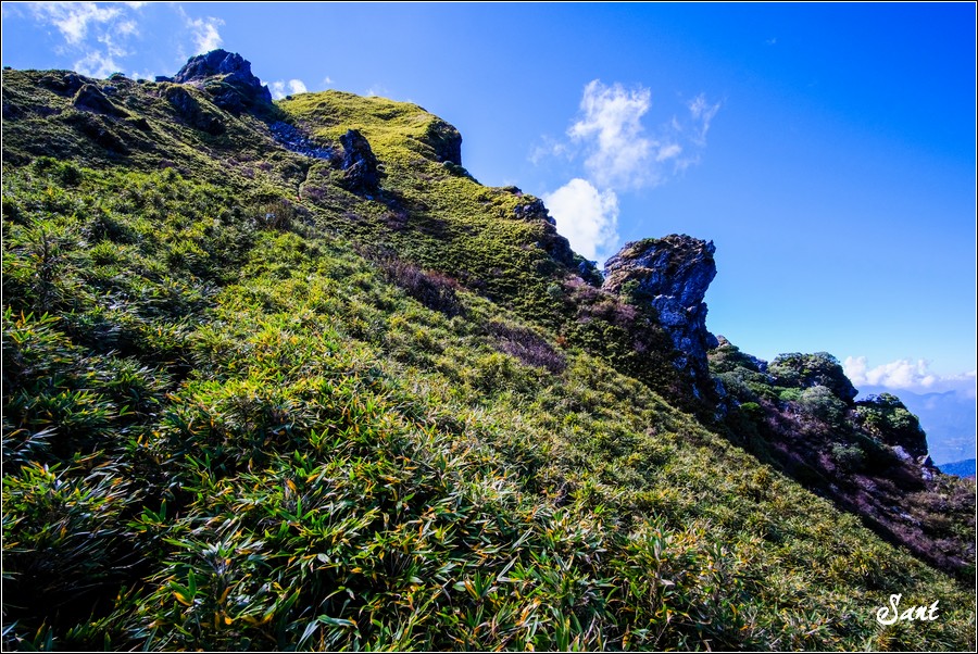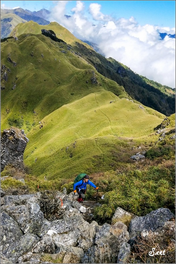 隊長與前方隊伍似乎不為大景所動,繼續以他們快速的步調前進,老狼只想貪婪的躺下來優哉游哉享用這片美景片刻。就好像小時候跟著阿嬤進甘仔店買豆油,阿嬤急著要回家煮晚餐,硬拉著瞪大眼睛、兩腳釘在光滑有點凹凸的泥土地板上的猴死囝仔(那個年代老狼當狼還晉升狼族)要離開甘仔店,牆上、櫥櫃、糖罐裡的都是讓人口水直流的各色糖果、玩具,太誘人了。