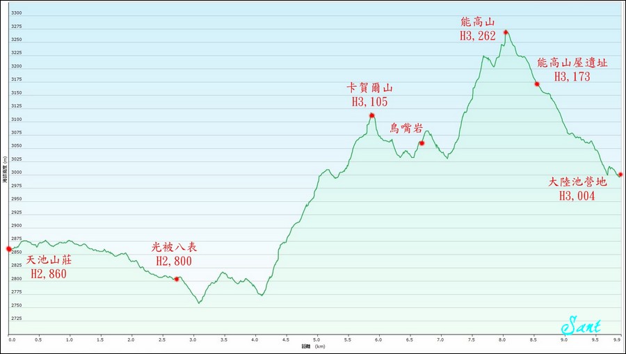 (天池山莊→卡賀爾山→能高山→大陸池營地高度落差圖)