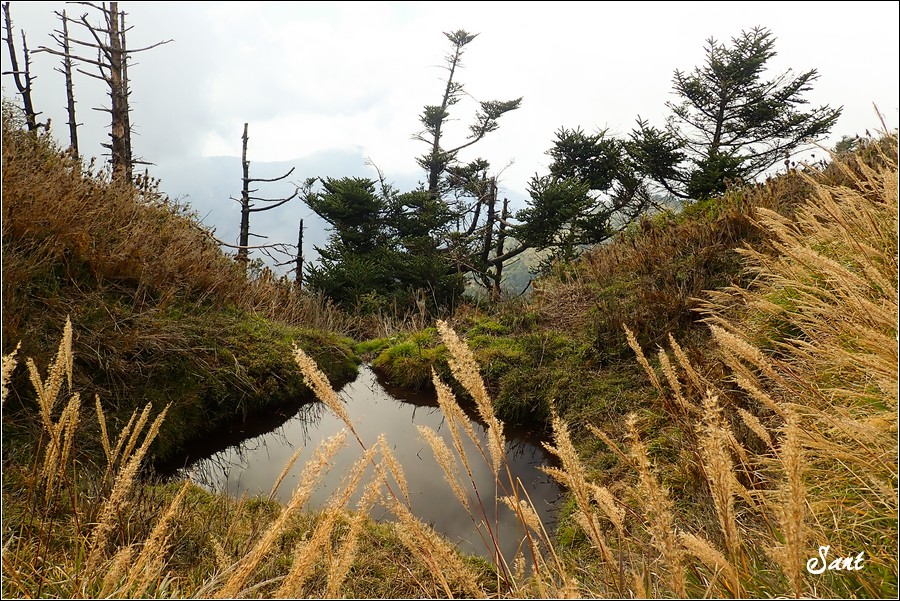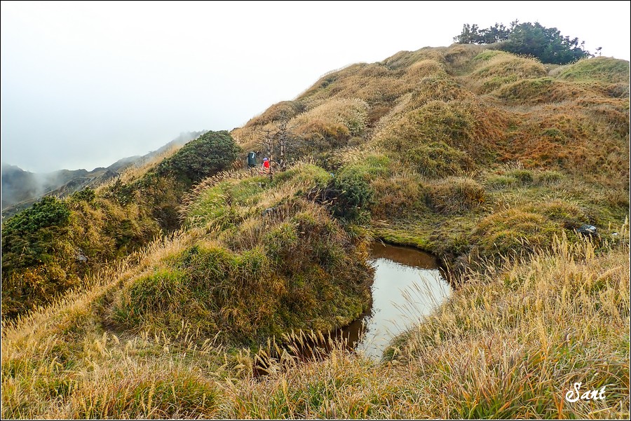 菜園正忙著脫下右腳的登山鞋和襪子做清理工作,她剛才不小心踩入路徑上的暗坑,很不巧暗坑是照片中水池的一小角,隱藏在箭竹草皮裡。菜園說她的登山鞋子裡、襪子都濕透了,池水非常臭,她很傷腦筋。
