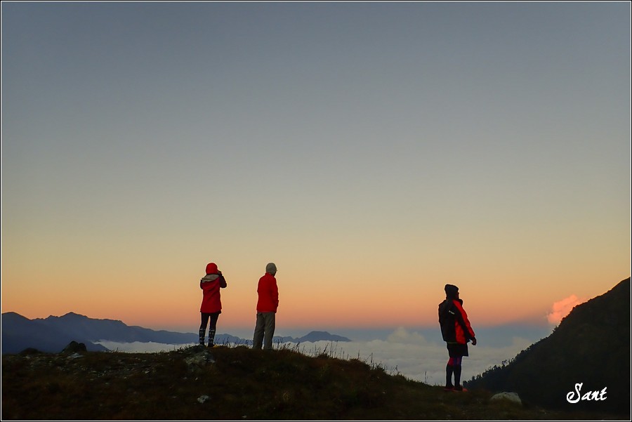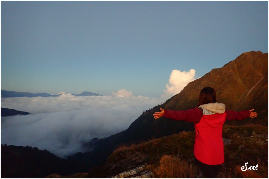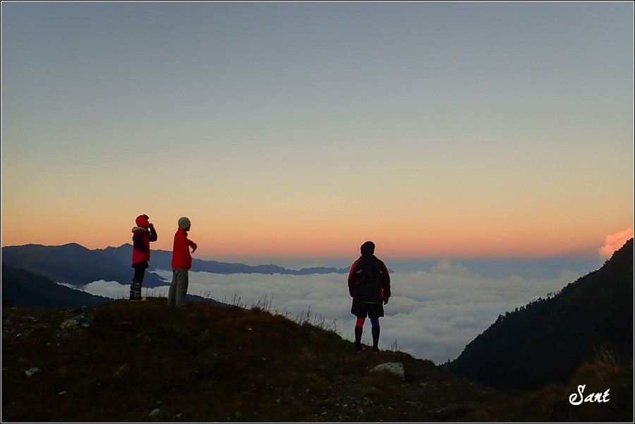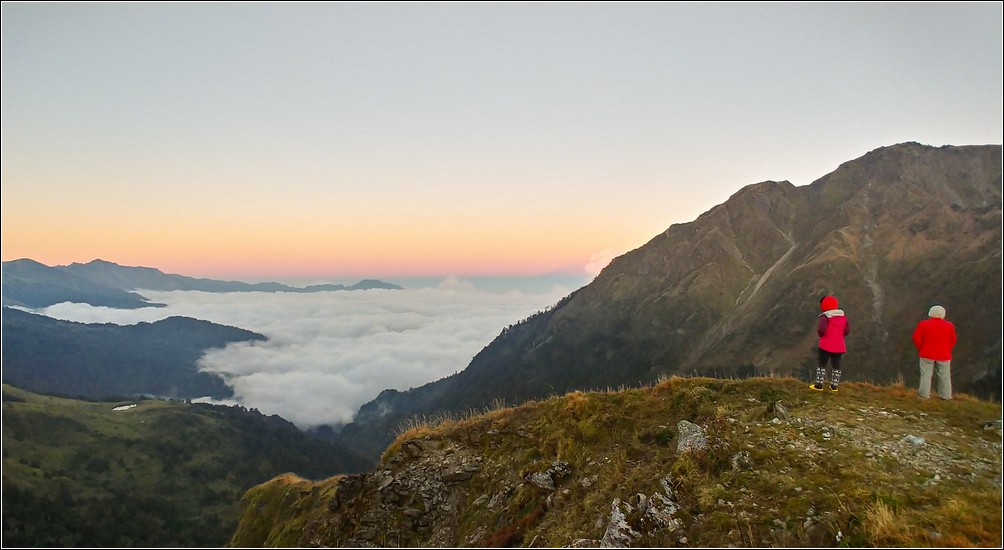 17:15 薔薇、洪峰隊長、poter小豪想追逐腳底下翻滾雲海,小豪勸退,因為這一帶山勢陡峭,看得到的都很遠。