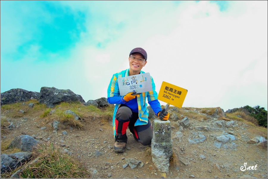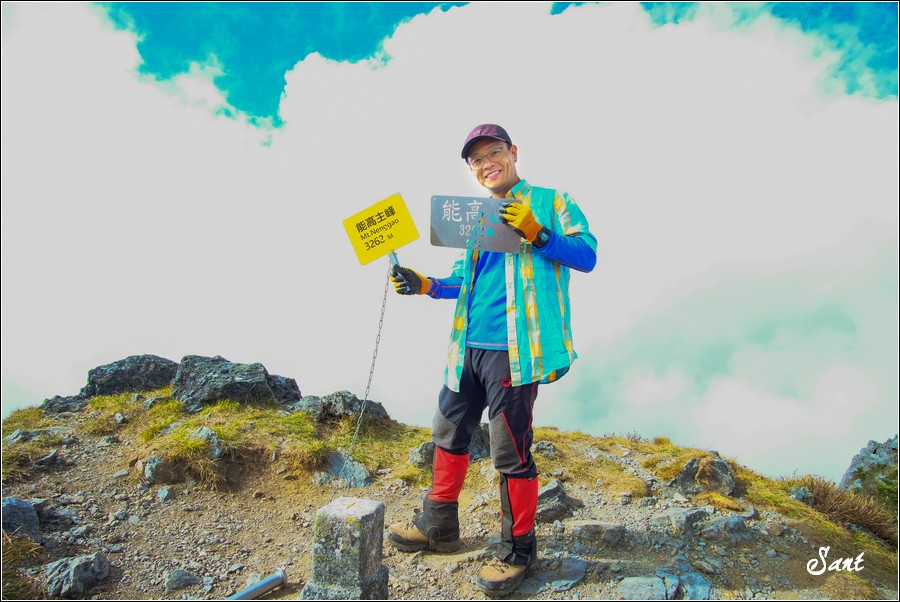 13:38 老狼也噴上能高山,因為這群復仇者聯盟都很愛拍照,所以暫時搶不到能高山三角點紀念牌,先欣賞一下雲霧很重的周邊風景。