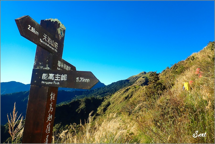 由指示牌往前直行,隱瑟的高大茫草已經將通往能高山的路徑暫時隱藏了,狼怪昨天下午在天池山莊走廊與來自台中清水的一群老大姐、老大哥們哈拉打屁,老大哥:「你們是走奇萊南華嗎?」