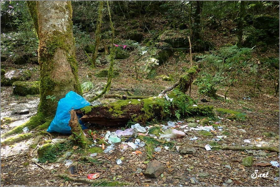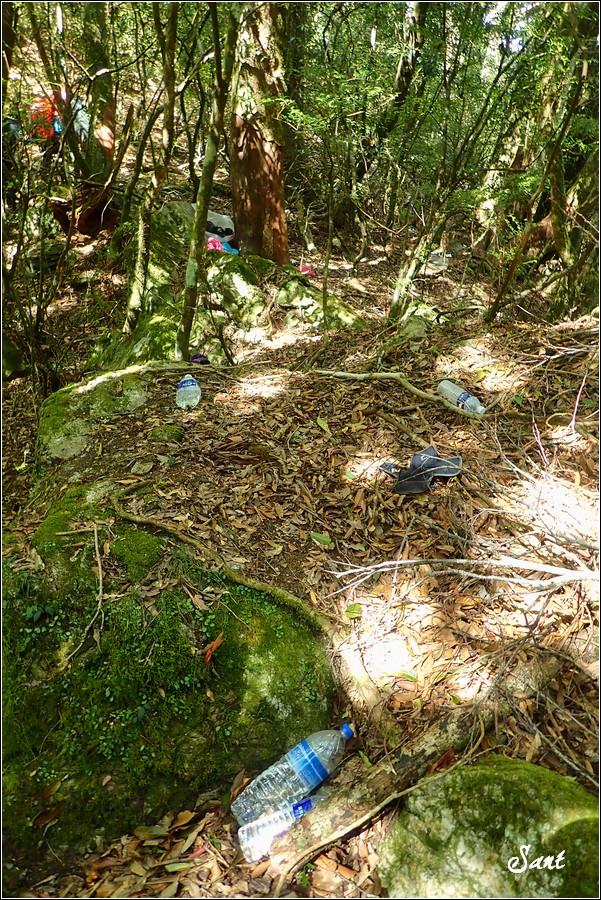 過了第二獵寮不久,路徑旁又出現比剛才第二獵寮營地更多的垃圾,這裡的垃圾全是不久前山友所丟棄。隊長請老狼多拍幾張,剛好薔薇在最後一隻,請她幫忙拍照記錄,這張照片的後面藏了更多垃圾。