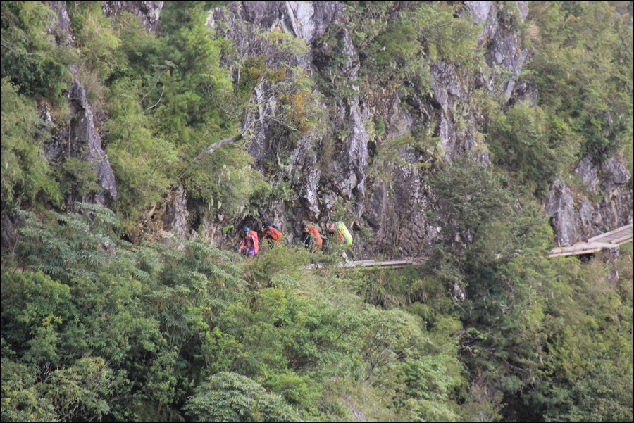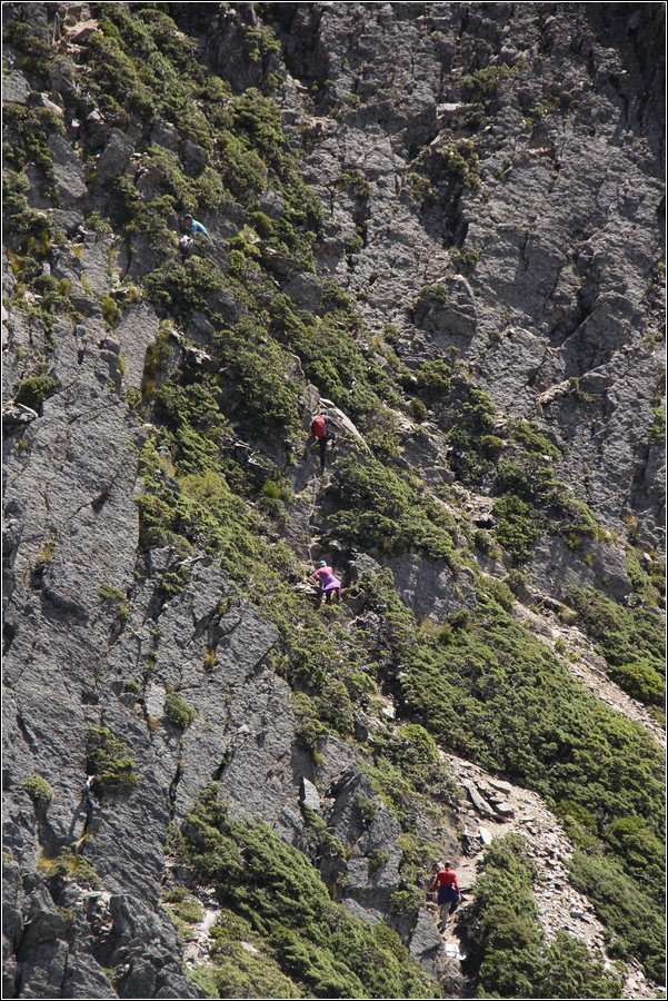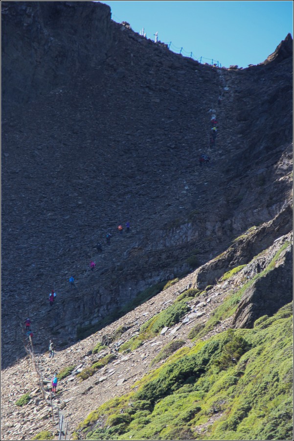 11:10 玉山東峰鐵鍊區分三段,為了確保不被前方隊友腳下落石砸中,最好保持相當距離,每一段都一個接一個上攀,不怕一萬只怕萬一。