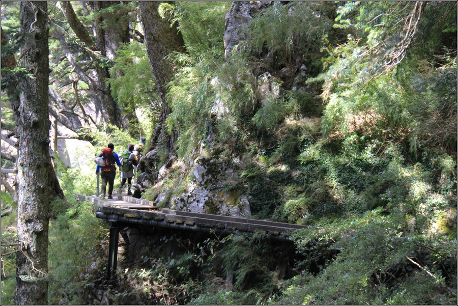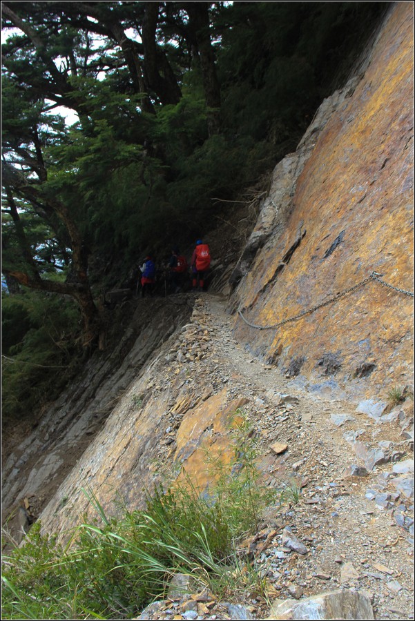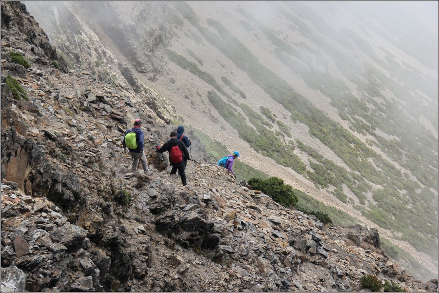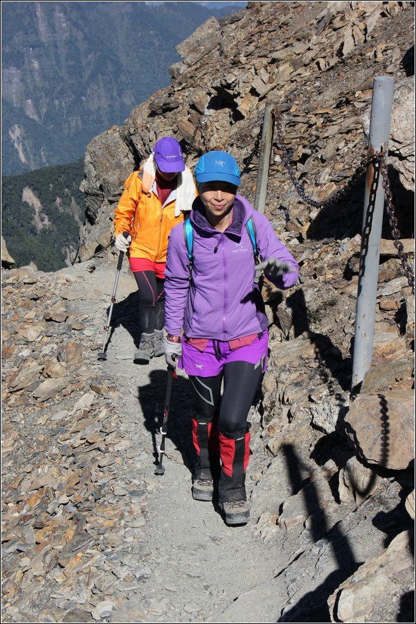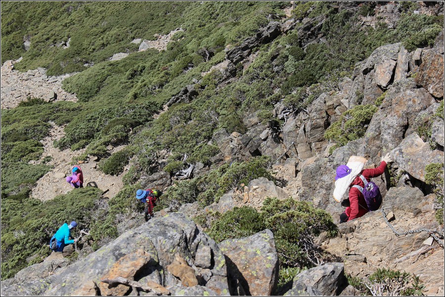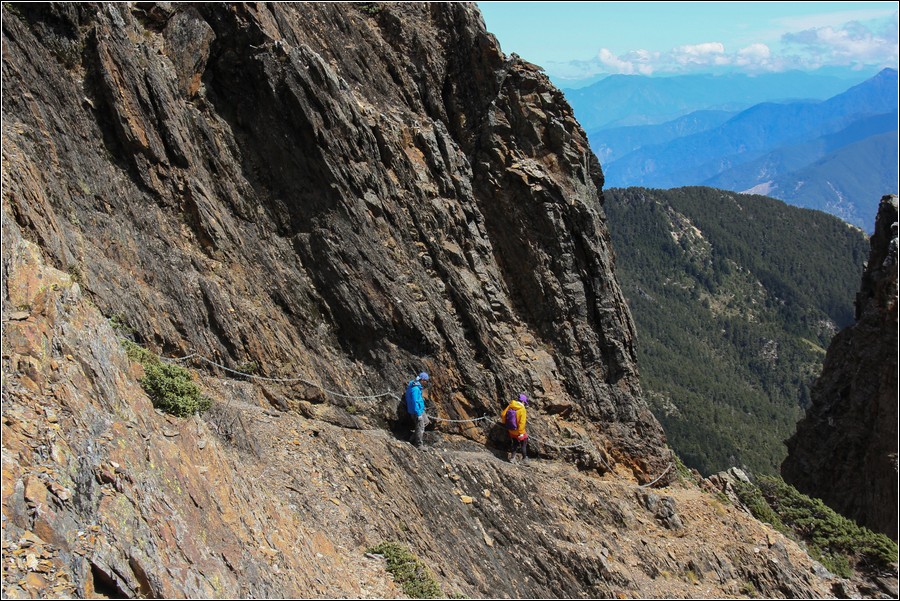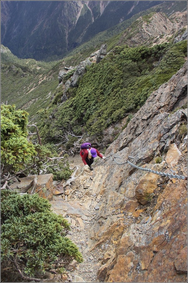 10:20 主東叉路垂直岩壁有鐵鍊確保,下垂直岩壁到一處小平台,坤正拍攝左前方隊友繼續沿著岩壁往東北面下切,玉管處在危險路段設有岩壁鐵鍊可供確保。