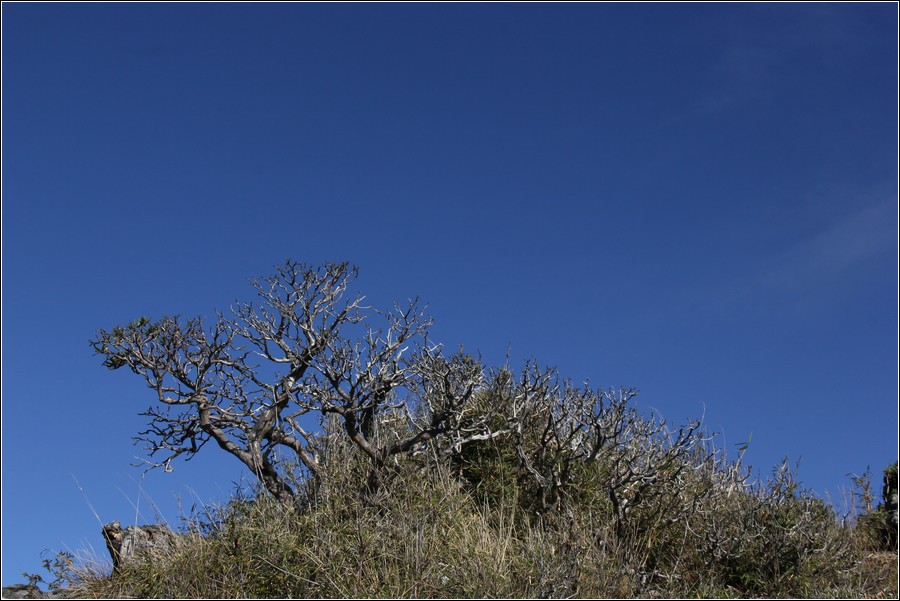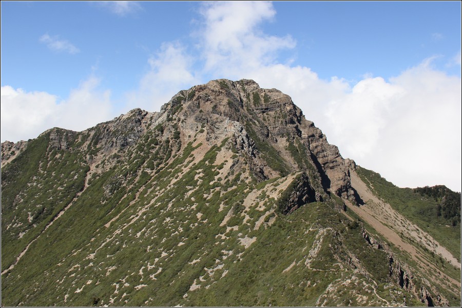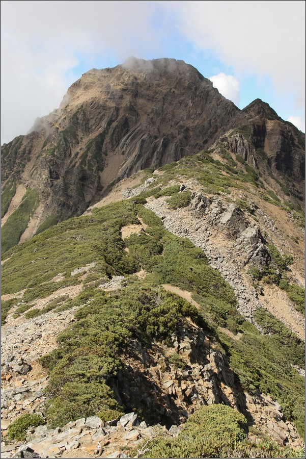 玉山主峰南面這道連綿到玉山南峰的稜線,就是稜線捷徑,有危險性,老狼戰戰兢兢走過數回,不建議山友輕易嘗試,還是依照傳統路線行走以確保行程平安。