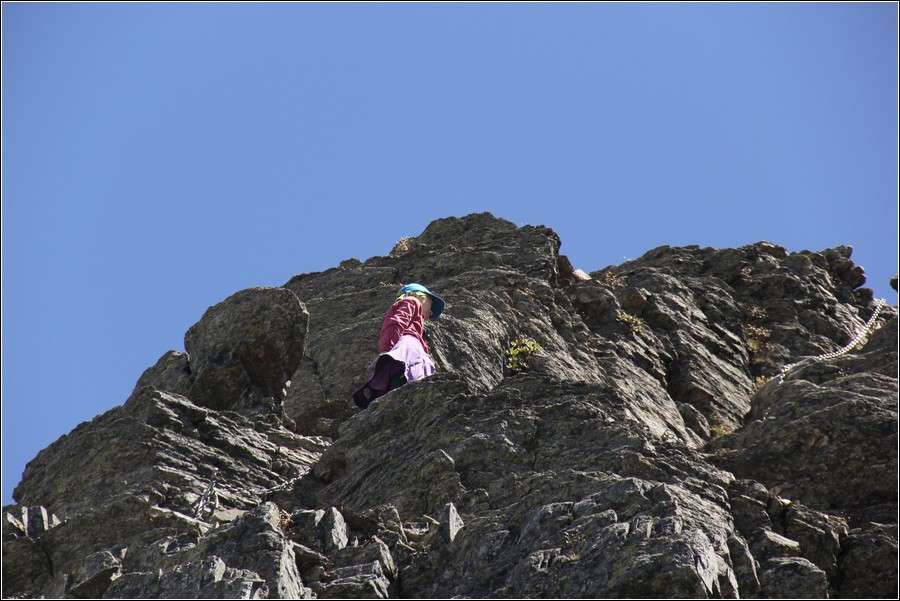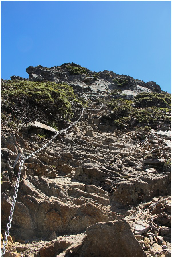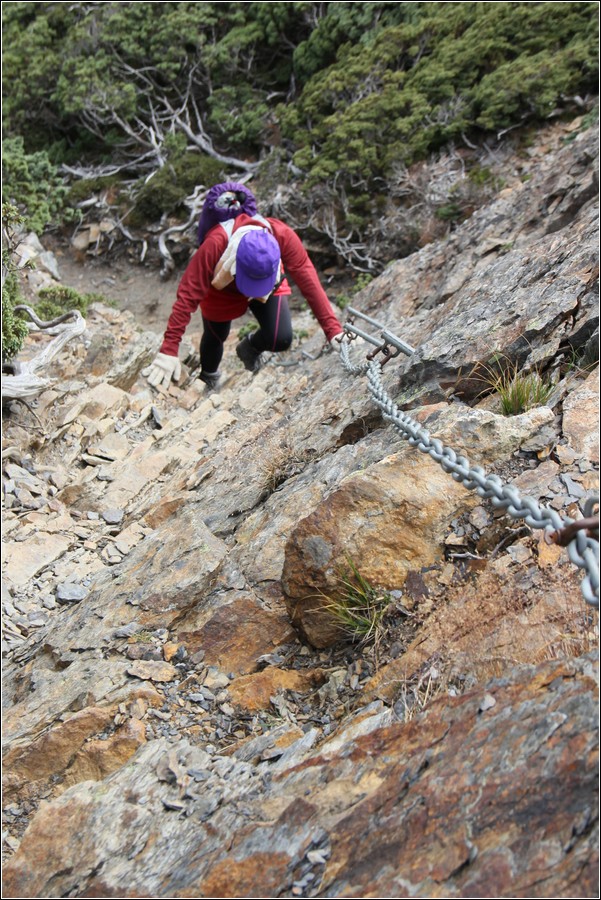 10:49 小紅帽已經抵達玉山東峰底部,開始依靠確保鐵鍊往上攀登。小紅帽第二次造訪玉山東峰,因為有鐵鍊確保,只要膽大心細,安全度是OK的。